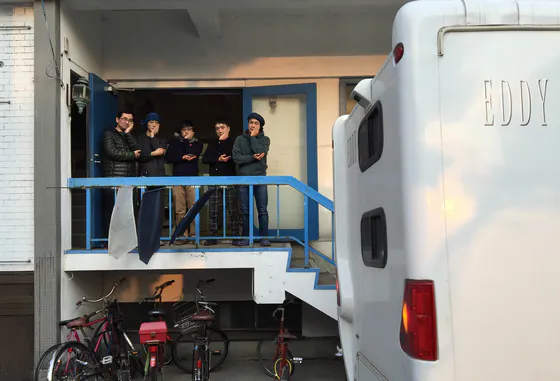 上の階ではめでたいパーティーが行われている中、下の階では男の子3人が「死にたい」と叫んでいるような芝居を上演している。