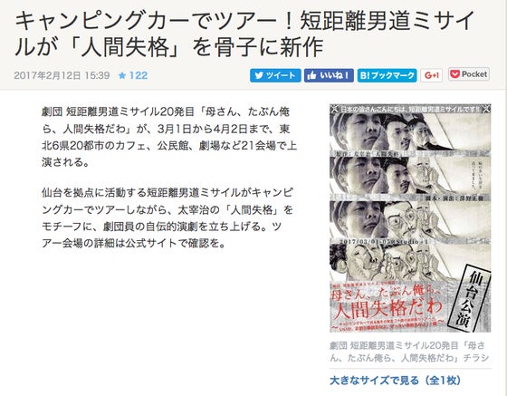 おかげさまで、クラウドファウンディングもなんと20%を超えることができました。これも、ご支援いただいた方々のおかげです! さてさて、気になる「母さん、たぶん俺ら、人間失格だわ(略)」は仙台公演の本番を明日に控え、現在最終追い込み中です! いやー、部屋は小道具や衣装で溢れ、服や髪も乱れつつですが着々と作品が仕上がっております。 先日岩手県は盛岡へ宣伝&交流に向かい、8劇団13人の方と交流することができました。盛岡演劇界は世代の垣根や、劇団の垣根を越えての交流が本当に盛んで、勉強になる時間でした。みなさん、ありがとうございました!!! 活動を振り返りつつも、明日が初日!!!!拠点である仙台で勢いをつけて、これからのツアーに弾みをつけて参りますよー! Studio+1にて、みなさんのご来場おまちしております。 ▼プロジェクト掲載&出演情報本プロジェクトの情報が、下記でご紹介されましたー!・河北新報 2017.2.26(日) 朝刊 ・Web東奥 https://www.toonippo.co.jp/lifeinfo/2017/20170223022780.asp・S-style 2017.3月号・塩竈市コミュニティエフエムBAYWAVE「しおなびげーしょん」2017.2.23出演・fmいずみの「be A-live」2017.2.28出演