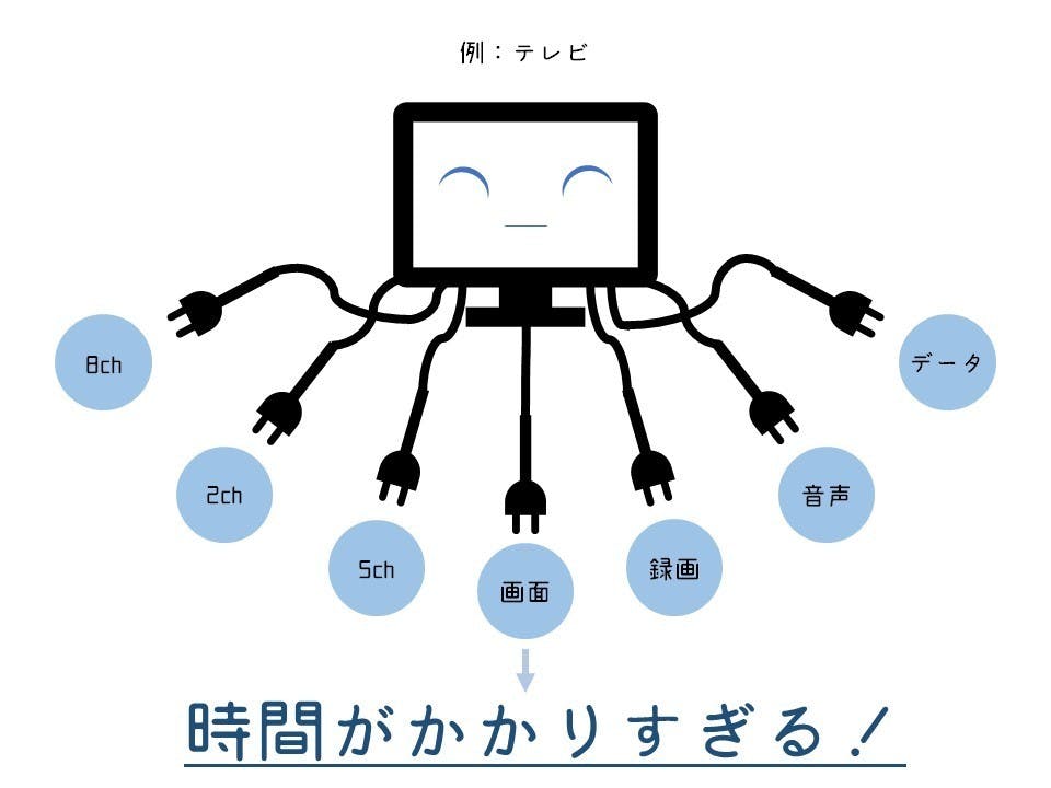 なんで、時間がかかるかっていうと、投影機がでかい・重いっていうのもそうなんですが、電源が多いんですね。7個くらいあるんですよ。1つの投影機に対して7個。7個も電源コードついてる電化製品見たことありますか?あったら大変ですよね、コンセントを用意するのも大変です。そして、結果的にセッティングに時間がかかっています。