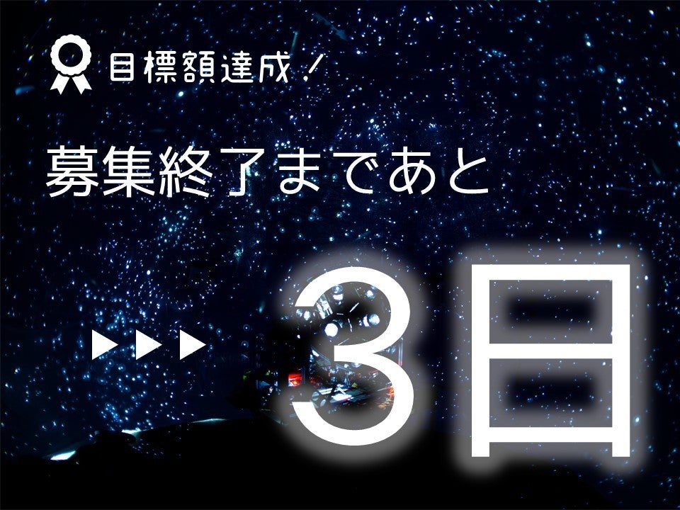 募集終了まであと3日!いよいよここまで来てしまいましたね!!本日よりカウントダウン企画「メッセージリレー」を開始します!企画と言っても、各担当からコメントを公開するだけですが…初日はわたくし広報担当と、ワークショップ担当です!(明日、明後日は違うところの担当者がコメントいたします)【広報】こんばんは!広報です!今までご支援・応援してくださったみなさん、本当にありがとうございます!わたしはチラシ制作に向けて動き出したところです。デザインって難しいですね…広報は現在、こんなところに取材お願いしてみたら?や、こういうふうにツイートするといいよーなど、より多くの方に広められるような広報のアドバイスがとってもほしいです!なにかご意見がございましたら、コメント欄でも、メッセージでも、Twitterでもメールでも良いのでいただけたら嬉しいです!よろしくお願いいたします_(._.)_【ワークショップ担当】はじめまして!イベントのワークショップ担当です。これまで支援をしていただきありがとうございます。今は子どもたちに作ってもらう望遠鏡の試作をしているところです。クオリティーと製作の難易度のバランスを取るのに少し苦戦中です。少しでも良い経験を子どもたちにしていけるよう頑張っていきますので、これからも応援よろしくお願いします!
