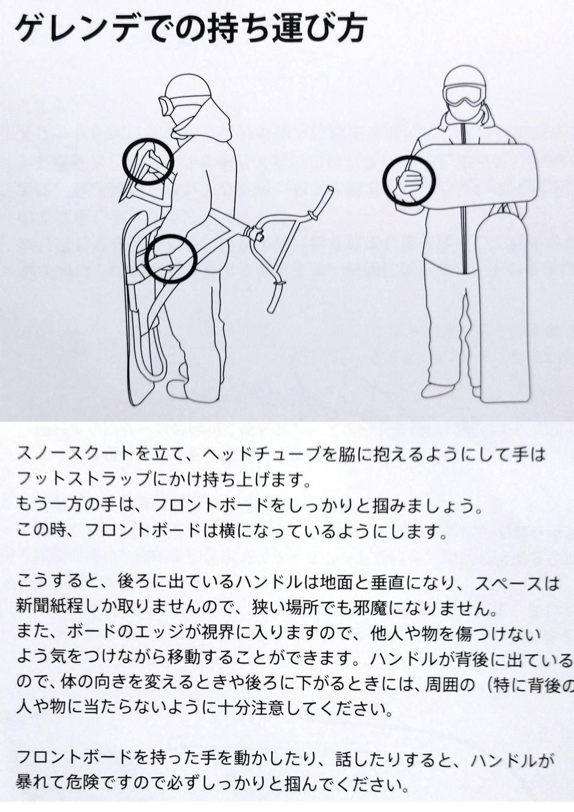 スノースクートの基本知識、ストラップや流れ止めの使用方法、リフトを使用しない斜面での止まり方、曲がり方、転び方。