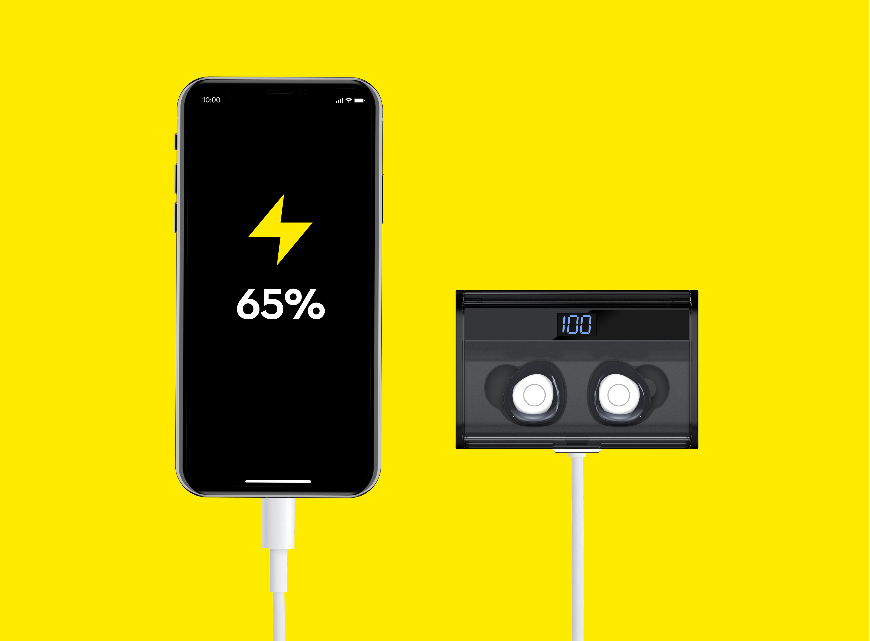 ポータブル充電ケースで移動中にもバッテリーを充電できます。内蔵バッテリーによりMuveイヤホンを18〜20回充電でき、最大100時間の音楽再生が可能です。またスマートフォンの予備バッテリーとしても使用でき、iPhone Xなら65%まで充電可能です。*PowerPlusケースはアドオンアイテムとして別売りです。