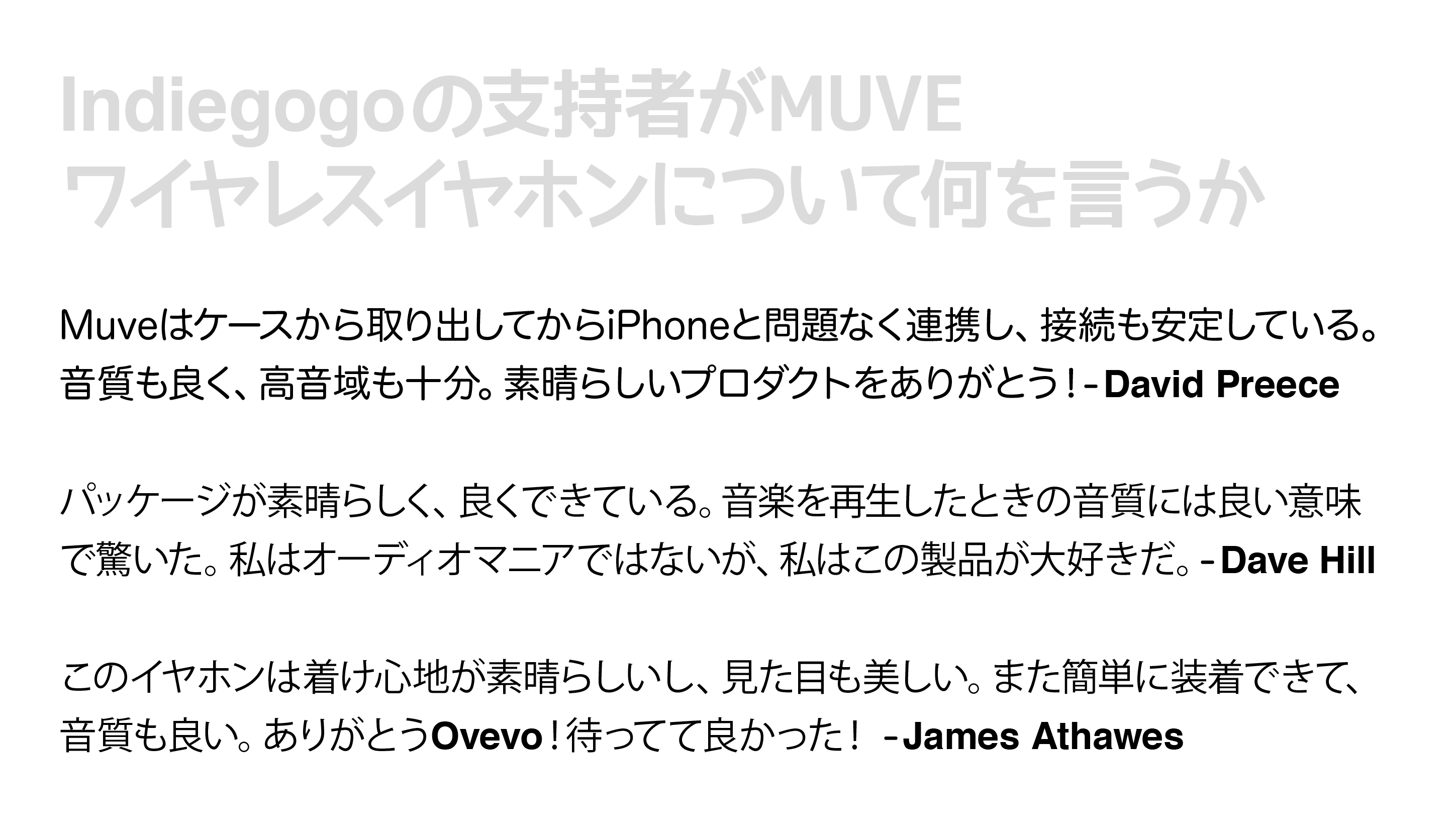 スポーツと音楽は質の高い生活のために常に追及される。それは生活態度そのものであり、それこそがovevoの精神である。全体的にovevoによる音楽は他のBluetoothヘッドセットを凌駕し、ロー、ミッド、ハイレンジはすべてより良いバランスを示し、ピュアなサウンドを提供する。