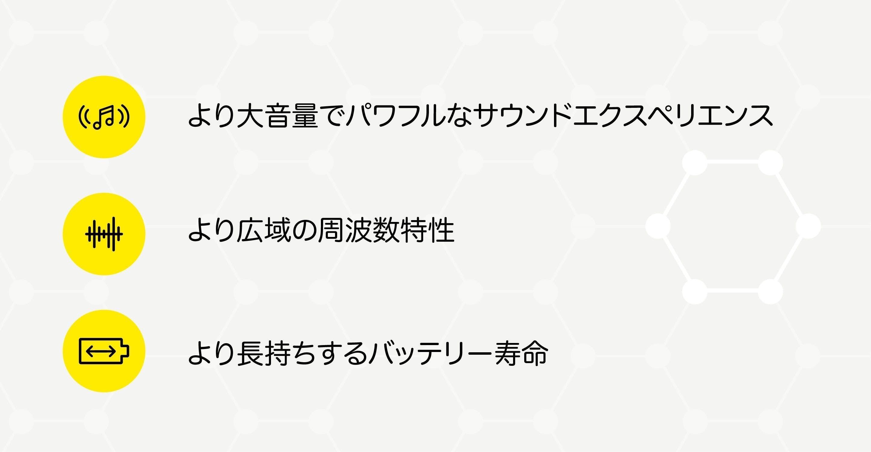 リーチを狭め絡まりやすいワイヤー方式を捨て、真のワイヤレスにより左右のチャネルが分けられ、耳により衝撃的な音質のエクスペリエンスをもたらす。