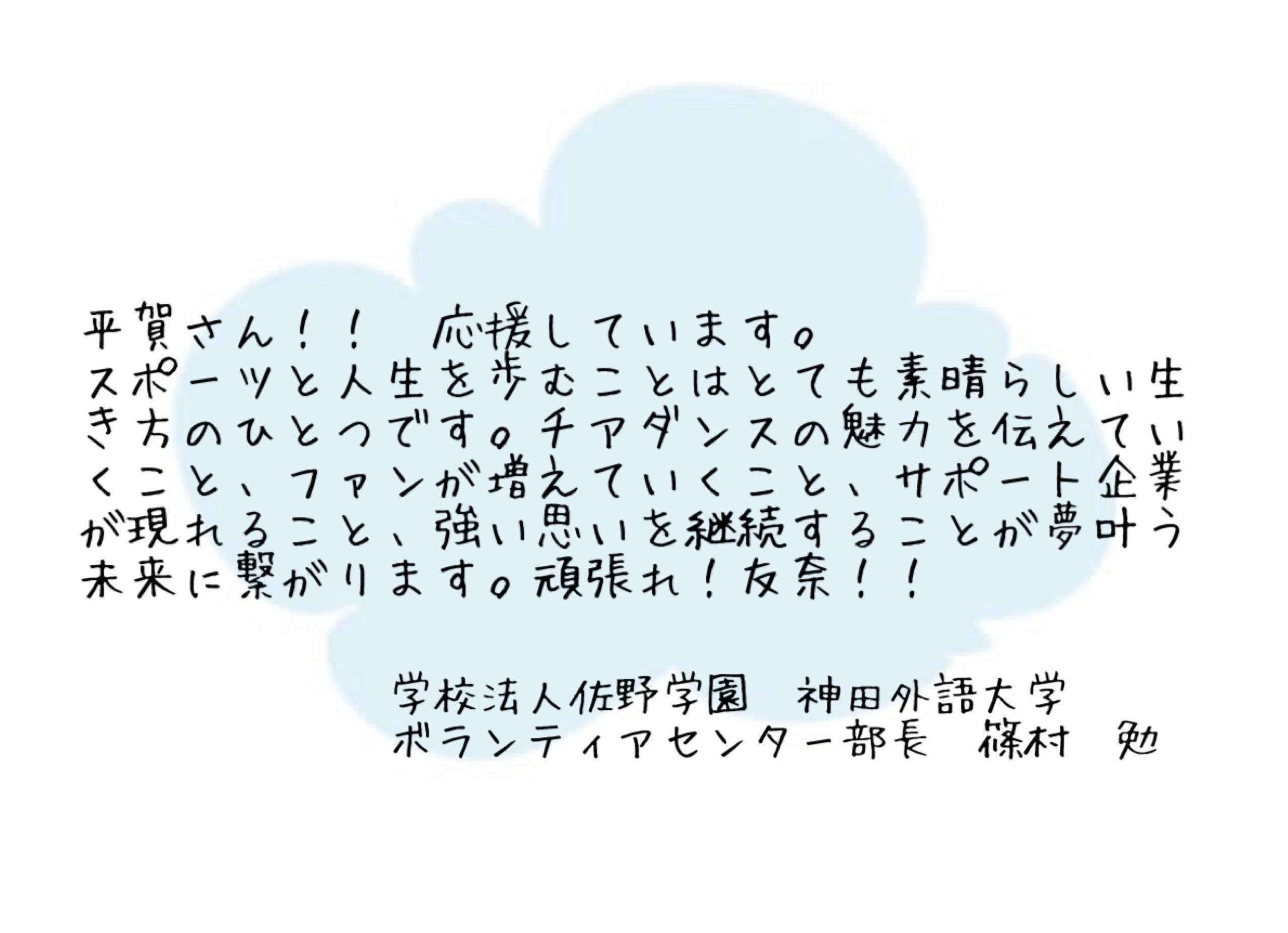 15000円 心を込めて書いたメッセージとショートムービーをメールにて送らせていただきます。個人、チーム、企業などでチアダンスのワークショップなど行う際に1回講師を派遣いたします。詳細はリターンの方に掲載しております。
