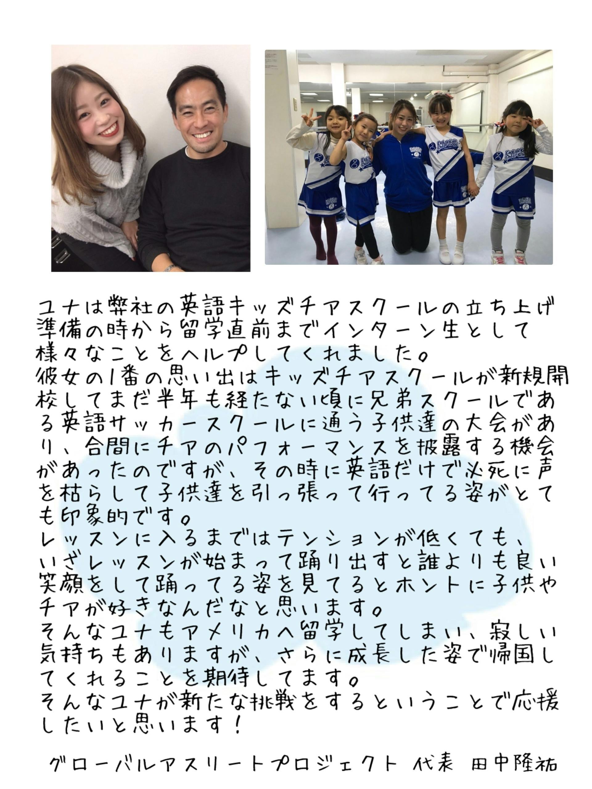 こんにちは。トビタテ留学Japan日本代表プログラム9期生に選ばれ、現在アメリカに留学中の平賀友奈(ひらがゆな)です。チアダンスというスポーツの素晴らしさに気づき、日本でもっとチアダンスを広めたい!チアダンスを仕事にしたい!と思い、大学を1年間休学しダンスの本場アメリカに来ました。将来はチアダンススクールの立ち上げと共に新たな取り組みとして企業研修などでチアダンスを使いコミュニケーション能力の向上やチームワーク形成を目的としたワークショップを行いたいと思っています!