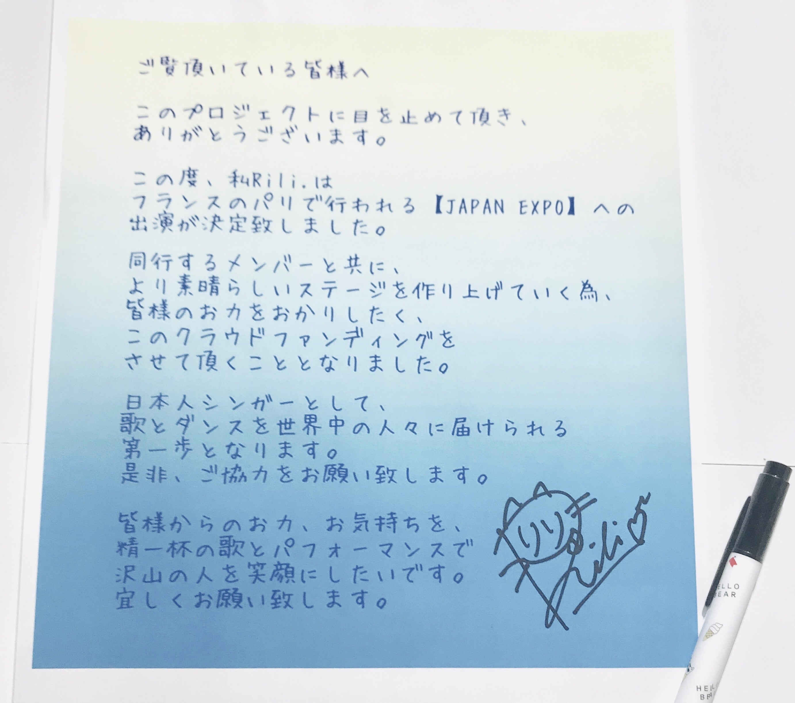 最後まで目を通していただきましてありがとうございます。ぜひ皆さまのお力をお貸しいただき、Rili.の世界進出への第一歩、笑顔の始まりとなりますよう御支援、応援宜しくお願い致します。一人でも多くのフランスの人々に【日本人シンガーRili.】を覚えて頂いて来ます! 頑張ってきます!! よろしくお願いいたします!!!
