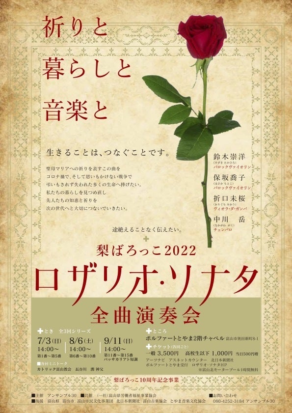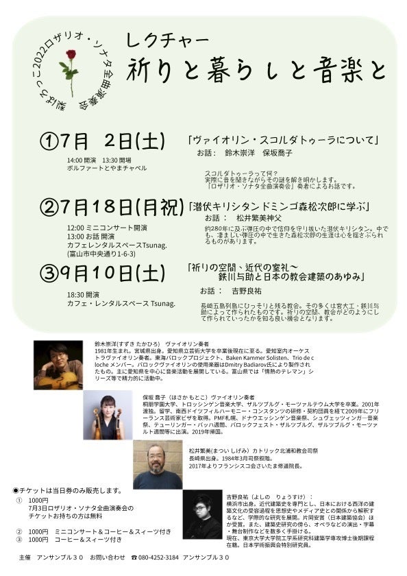 2022/10/03 08:302004年結成したアンサンブル30。地元富山で、Oneコイン教会コンサートを10回。2011年より、梨ばろっこコンサートを富山県内はもとより、お隣石川県や新潟県などで数多く開催して参りました。ロザリオ・ソナタ全曲演奏会開催がきっかけで、私たちの活動は北陸朝日放送のキャスター中田絢子さんの目に留まり、同放送の「ゆうどきLive」で取り上げられました。収録では、古楽の魅力についてキャスター中田絢子さんとしばらく語り、チェンバロを実際に弾いていただいたり、アンサンブル30メンバーで演奏をしたりしながら進めました。Vin.鈴木崇洋さんはこの日あいにく欠席で、残念でした。皆様と共に過ごしてまいりましたこの5ヶ月。◉ロザリオ・ソナタ全曲演奏会全3回。◉関連イベント全6回。1.プレトーク「バロックヴァイオリンって面白い!」 / 保坂喬子さん 2.プレトーク「ロザリオ・ソナタとは」&ミニコンサート(中川岳さん+折口未桜さん)3.プレトーク「スコルダトゥーラについて」/ 保坂喬子さん・鈴木崇洋さん4.「潜伏キリシタン~ドミンゴ森松次郎に学ぶ」&笛とチェンバロのミニコンサート講話:松井繁美神父 フランシスコ会さいたま修道院長 5.チェンバロ通奏低音レクチャーとワークショップ 講師:中川 岳さん (保坂喬子さん&折口未桜さん協力)6.「祈りの空間、近代の室礼(しつらい)ー鉄川与助と日本の教会建築のあゆみー 」講話: 研究者 吉野良祐さん5月4日から9月11日まで、準備を含めると約1年。おかげさまで無事に全てを終えることができました。クラウドファンディングご支援くださった皆様、ご来場くださった皆様、陰ながら応援してくださった皆様。改めて感謝申し上げます。皆様と、このロザリオ・ソナタ全曲演奏会を通じて広がった輪を大切にここ富山で活動を続けていきたいと思います。これからもどうぞよろしくお願いいたします。アンサンブル30 安岡厚子 もっと見る