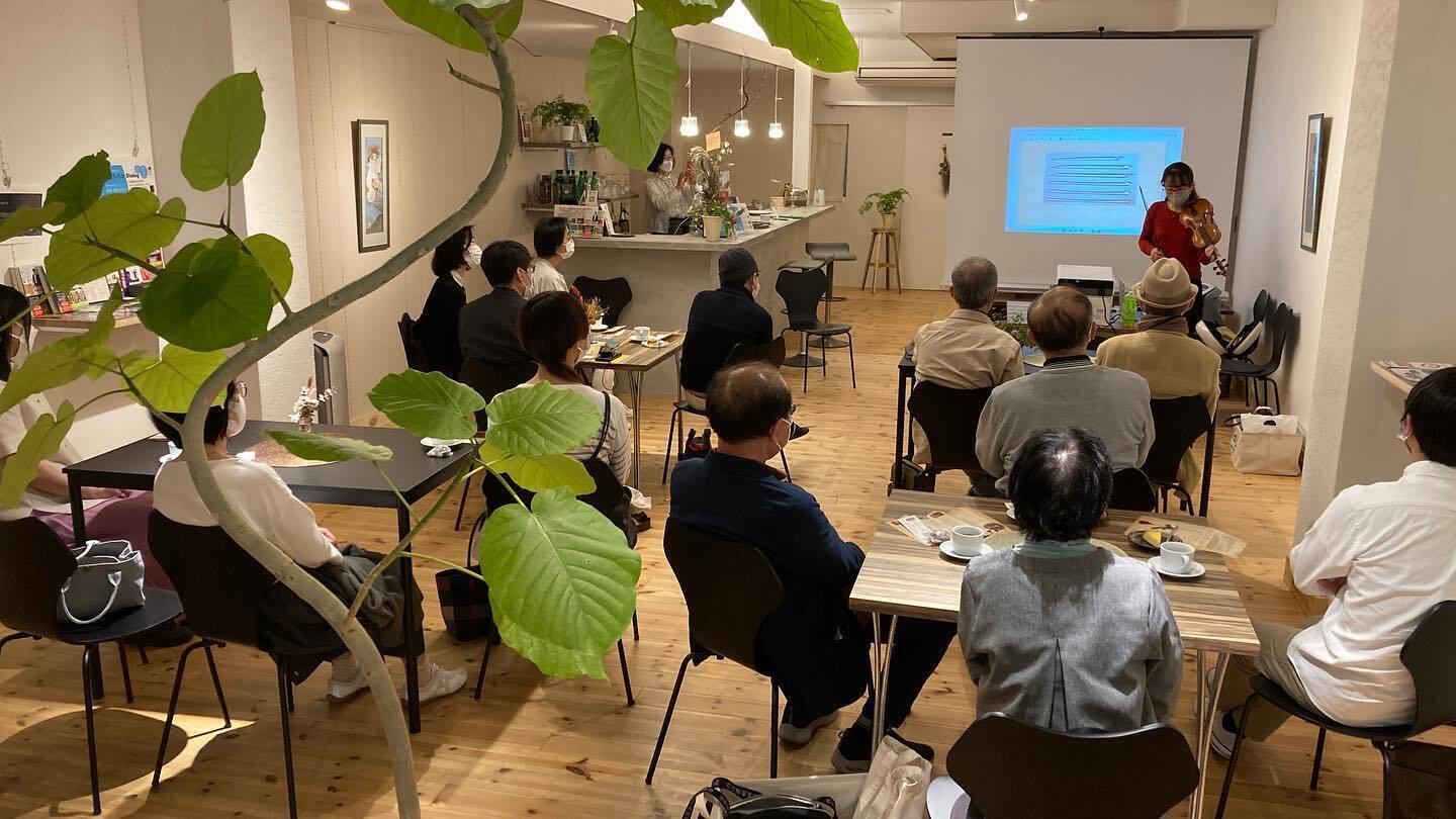 ロザリオ・ソナタ演奏会のヴァイオリニスト保坂喬子さんによるプレトークが5月4日、富山市中央通りカフェレンタルスペースTsunag. で開催されました。