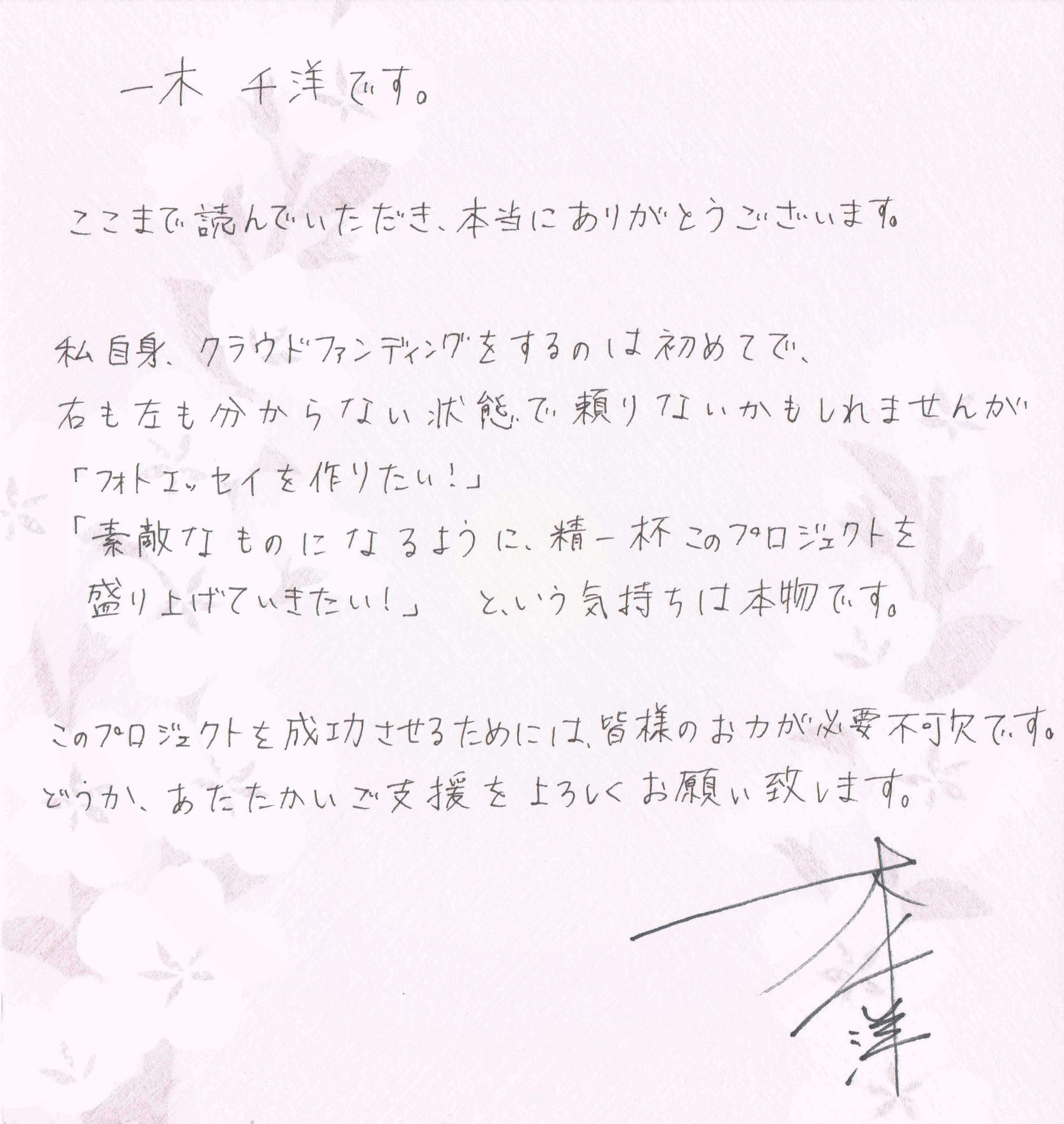 私自身クラウドファンディングをするのは初めてで、右も左もわからない状態で頼りないかもしれませんが、「フォトエッセイを作りたい!」「素敵なものになるように、精一杯このプロジェクトを盛り上げていきたい!」という気持ちは本物です。