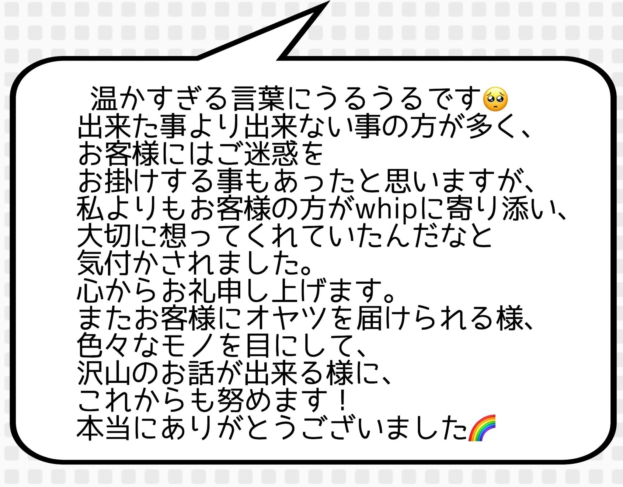 お菓子はもちろんですが、僕はwhipさんの「お店の空間」について是非皆様にも知っていただきたいと思いました。店に行くたび、いろんな話を聞いて、何もない空間から、柱一本、壁一枚から色々な思いを日々感じながら作り上げていたんだな、 そしてこれまで色々な苦労を乗り越えて頑張ってこられたんだなと感じました。閉店は寂しい事ではありますが、この経験を生かし、これからも新たな事にチャレンジしていってほしいと思います!