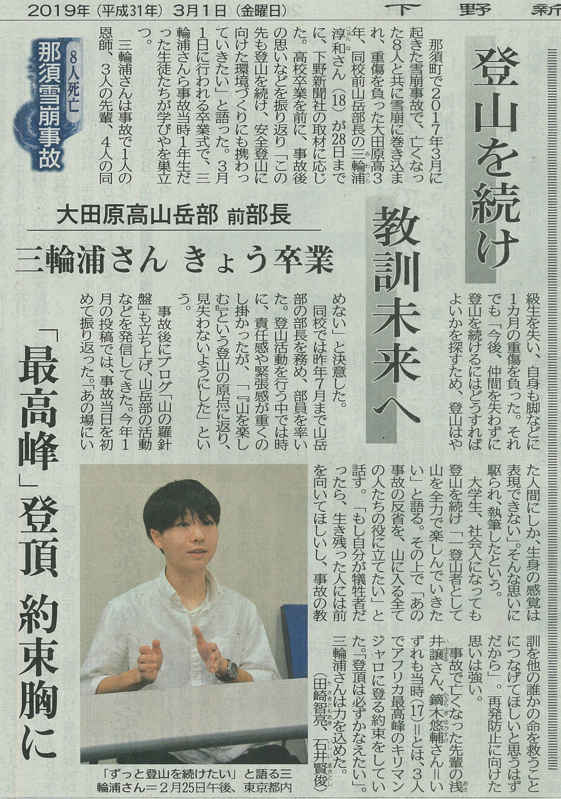 ご存知の方もいらっしゃるかもしれませんが、今から2年前の平成29年3月27日、僕たちは那須で行われた「春山安全登山講習会」に参加していました。その講習会の中で雪崩事故が発生し、同じ高校の先輩・同級生の7名と山岳部の顧問の先生の1名の尊い命が失われました。