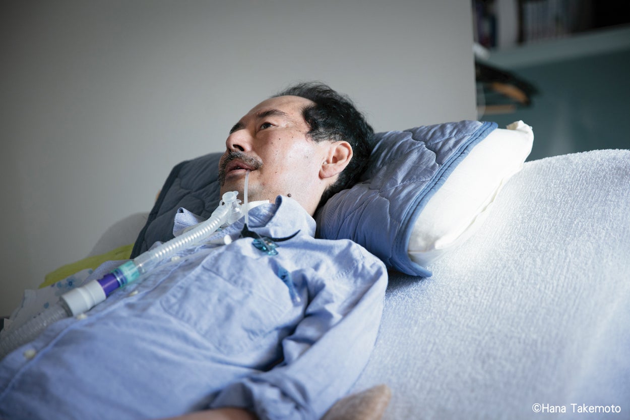ALS(筋委縮性側索硬化症)を発症して今年で12年目です。24時間人工呼吸器と共にあり、身体はわずかに動く口の動きと眼球の動き以外、自分の意思で動くところはありません。ですが、特殊なコミュニケーション方法を活用することで自分の気持ちを発信することはできますし、冗談を言い合ったり、喧嘩だって可能です。この文章もその方法で記録しております。発病当初、12年後の自分を想像することはまったくできませんでした。これも皆、私を支えてくれている方々がいればこそ、感謝に堪えません。