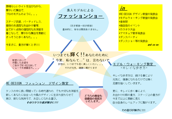 「素人モデルファッションショー」はモデルが全員素人であるにも関わらず、素人とは思えないほどの華やかなファッションショーであると言われており、「ファッション」という一つのカテゴリーを通し、人々に「新たな生きがい」を与えるものとなっております。