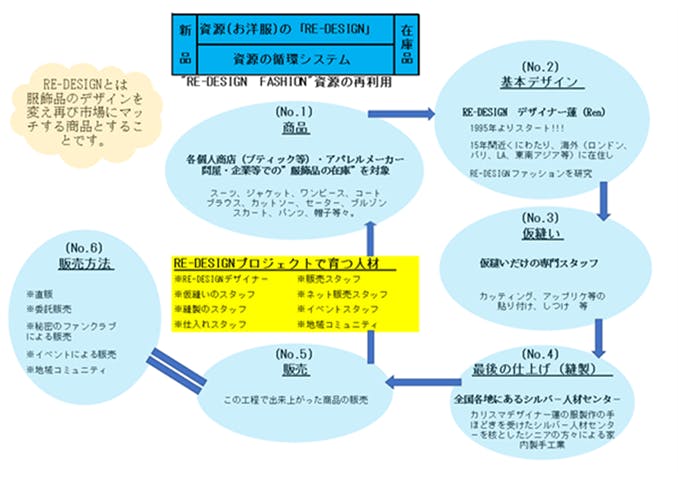 RE-DESIGNとは、各個人商店(ブティック等)・アパレルメーカー・問屋・企業等での「服飾品の在庫」を、ファッションデザイナー蓮が「RE-BONE」をテーマとして服飾品のデザインを変え再び市場にマッチする商品とするという意味です。