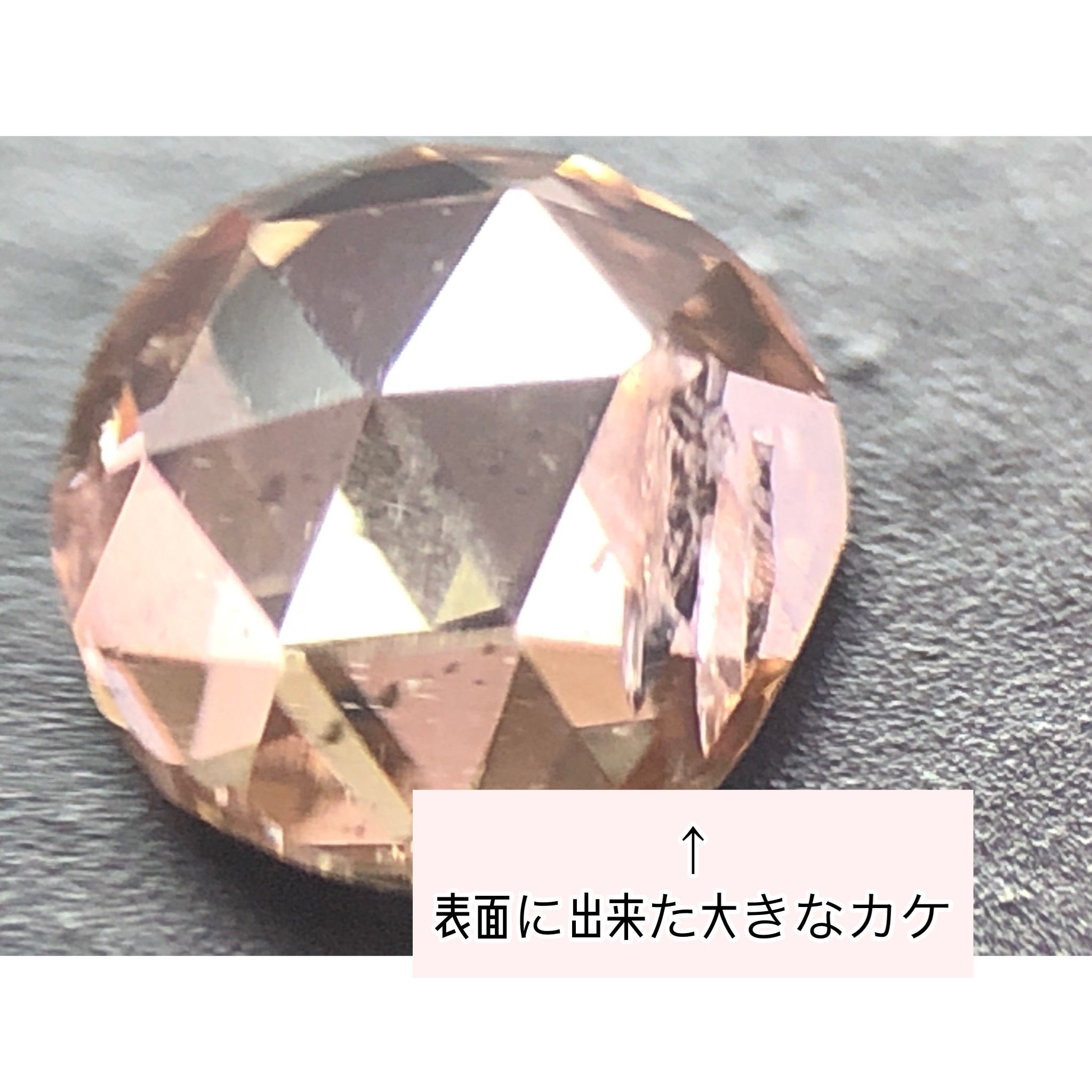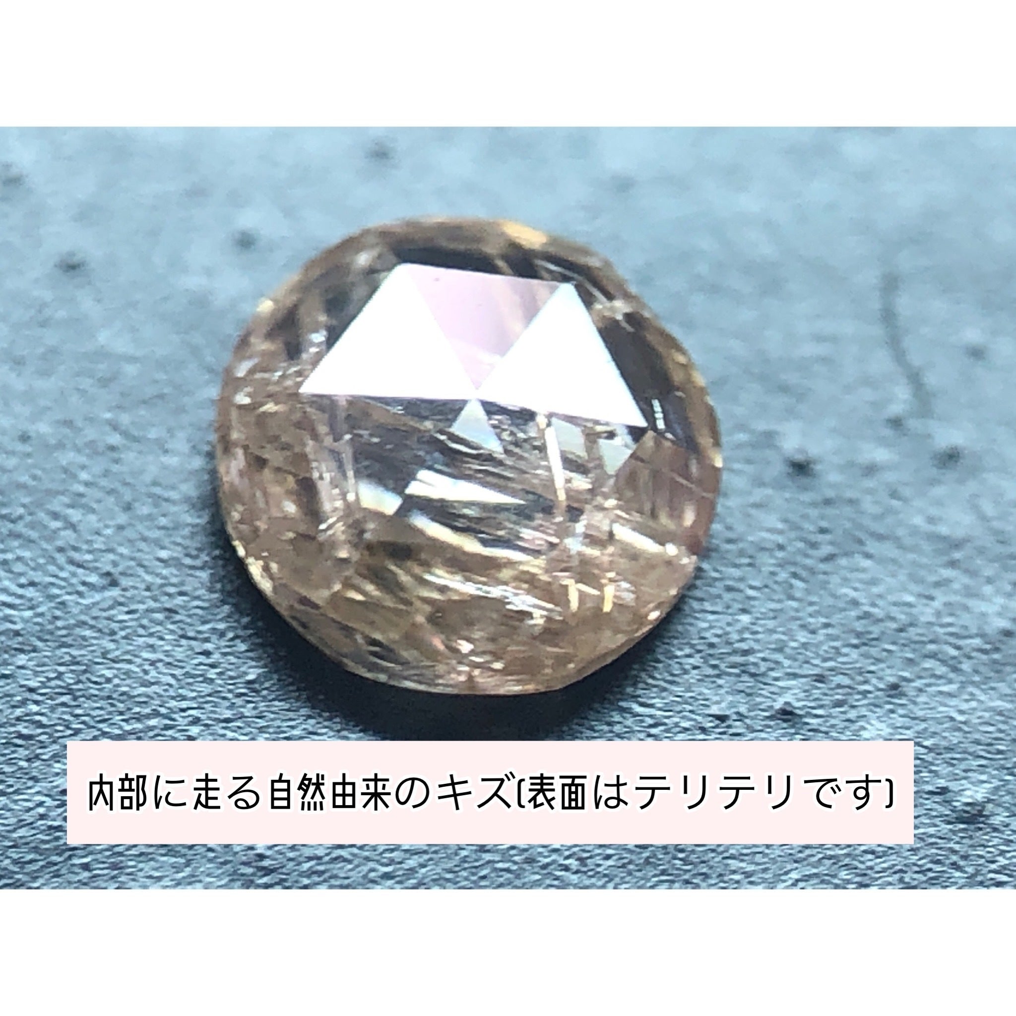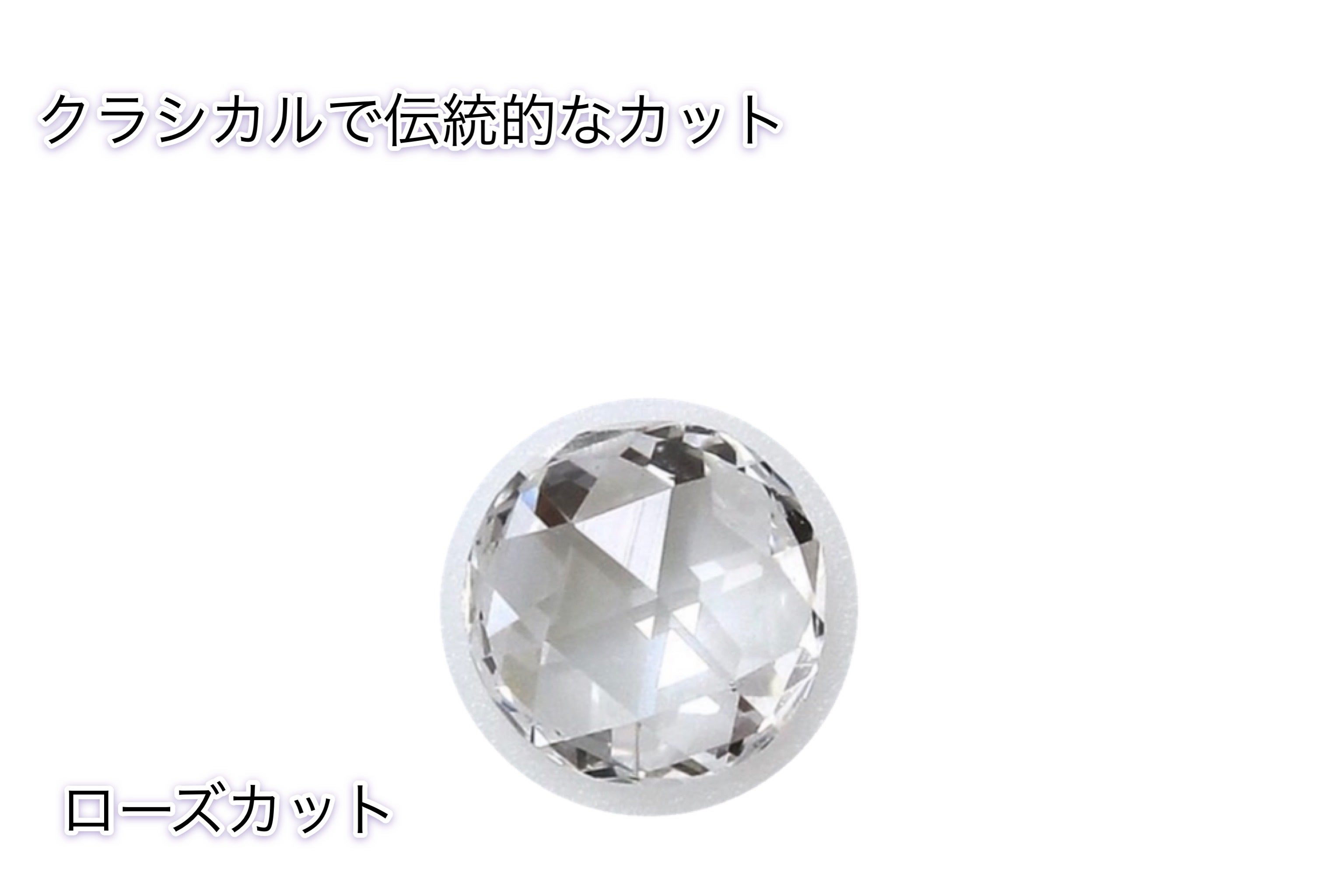 伝統的なローズカットは非常に古くからジュエリーに使われており、最近でも大手ブランドがファッションジュエリーにアクセントとして使用しています、女性からの人気も非常に高く、通常のラウンドブリリアントカットがキラキラと乱反射するのに対して、ローズカットはファセットの数が少ないため乱反射が発生しません。このローズカットダイヤも流通の過程などで、カケたり、自然由来のキズがマーケットに合わずに行き場のないものとなっています!今回のプレゼント用と通常のリターン品の品質も下記の参考写真を元にイメージしてください。