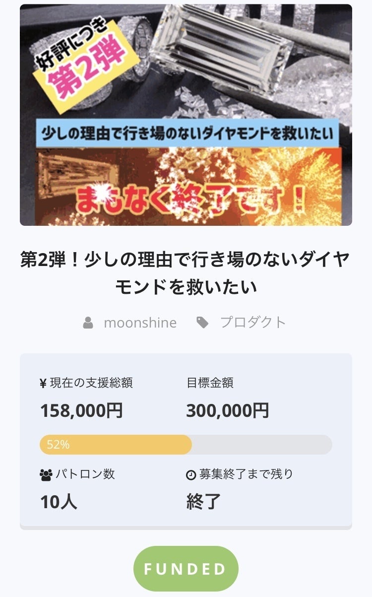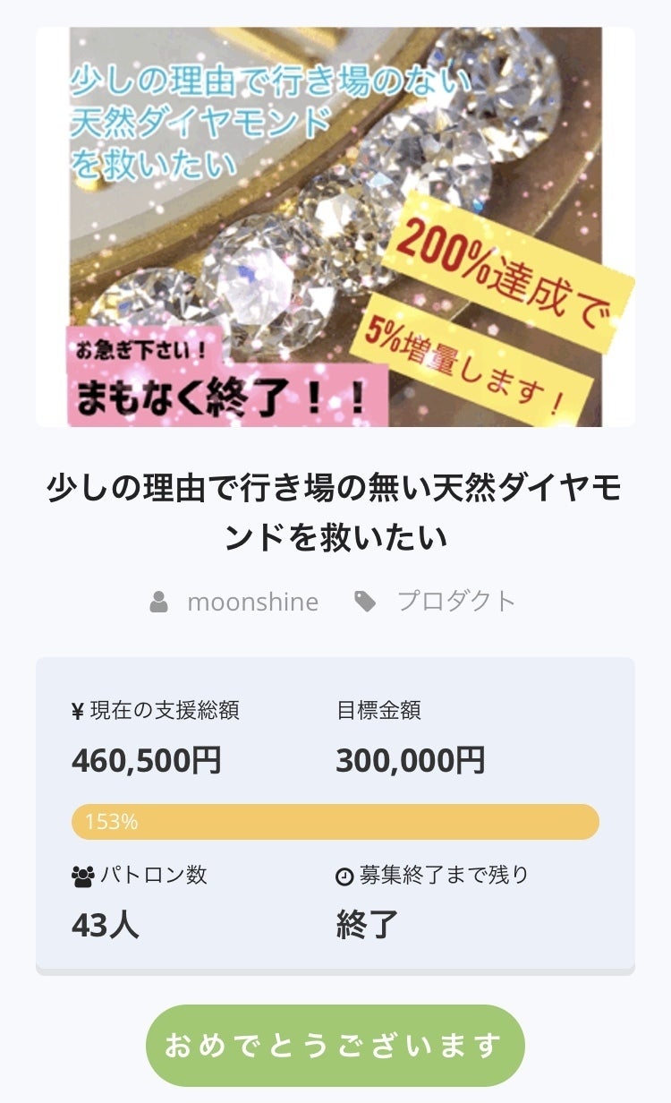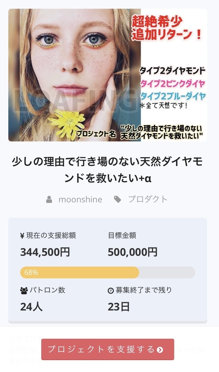 キャンプファイヤープロジェクト第1弾、第2弾と続き、第3弾が進行中ですが、"少しの理由で行き場のない天然ダイヤモンドを救いたい"よろしくお願いします!!