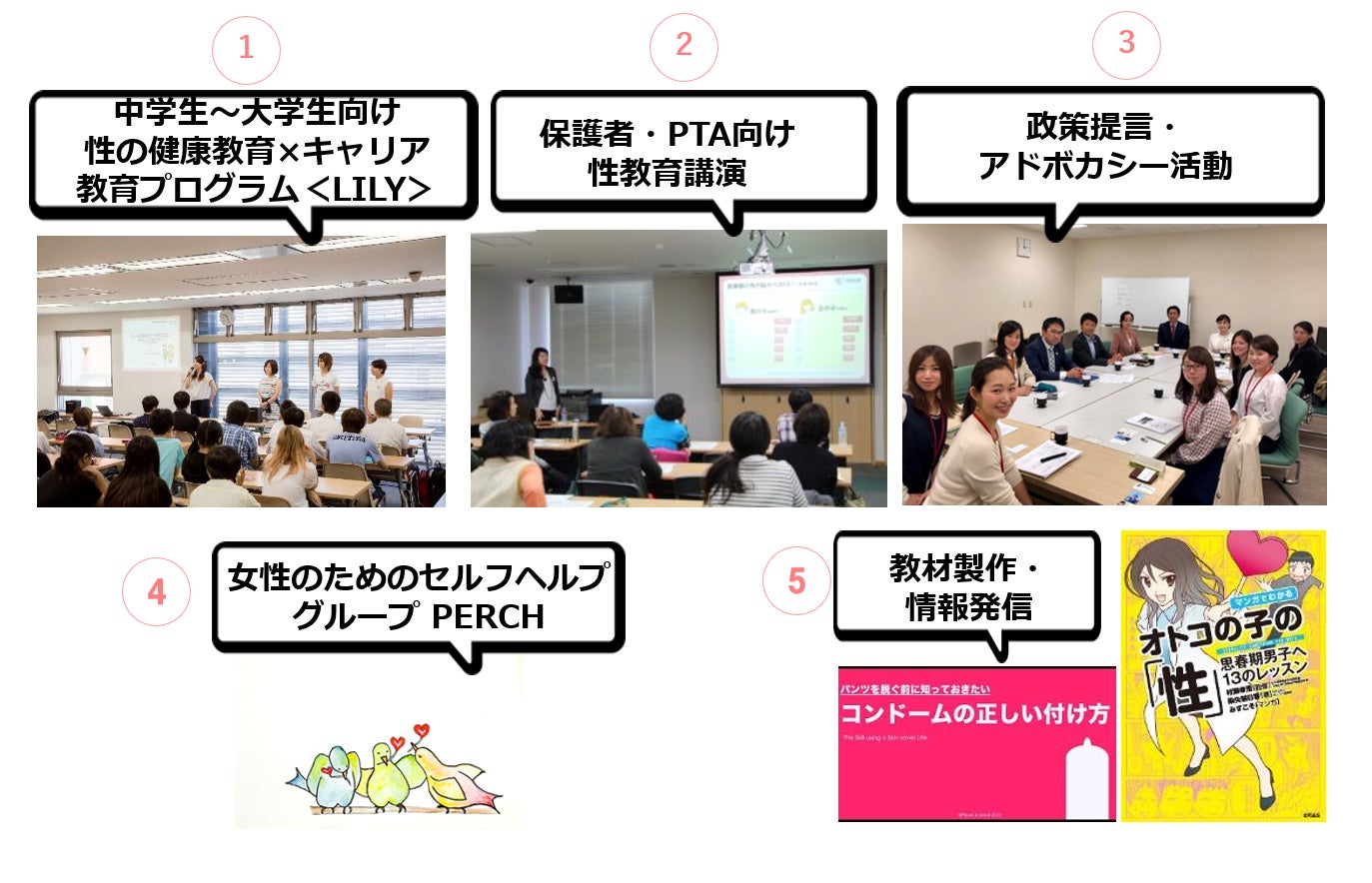 フェロー(若者スタッフ)を育成しながら、中高生~大学生を対象とする性教育 × キャリア教育プログラムLILYの実施の他、保護者向けの講演、政策提言として、署名活動や院内勉強会の開催、女性のためのセルフヘルプグループ(自助グループ)の運営、教材製作・情報発信等を行っています。