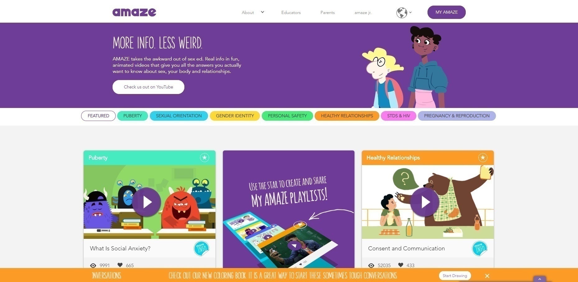 AMAZEは、性教育の専門団体が作成したオンラインで閲覧できる性教育動画で、4歳から14歳までの年齢に合った幅広い内容を取り扱い、世界中で活用されている性教育教材です。2019年5月現在、AMAZEは100本近くの動画ラインナップがあり、YouTubeで2300万回閲覧され、11万1000人の人がチャンネル購読をしています。