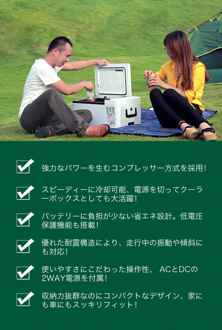 車載用のシガープラグ(DC)はもちろん、家庭でも使える電源(AC)も付属しております。12V/24Vに対応可能なシガープラグを、カーソケットに挿すだけで車内で冷蔵庫として使えます。また、お部屋で冷蔵庫として使えば、お出かけ前に冷やして事前の準備もできます。