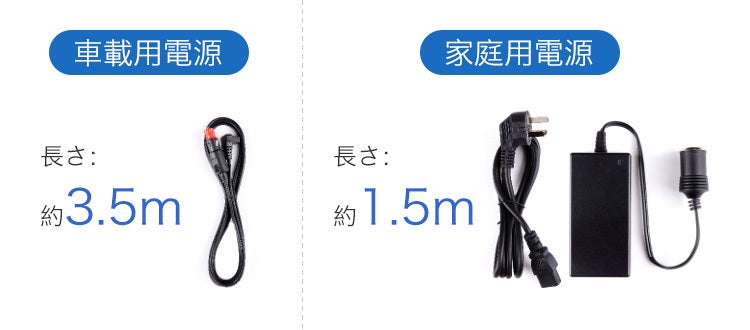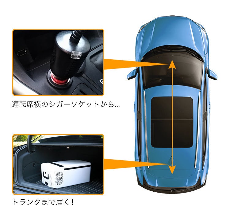 長さ約3.5mのDC用コードは、標準的なハッチバック型乗用車のトランクまで届きます。大人数でお出かけする際や、車内でお食事をするときにも大活躍。