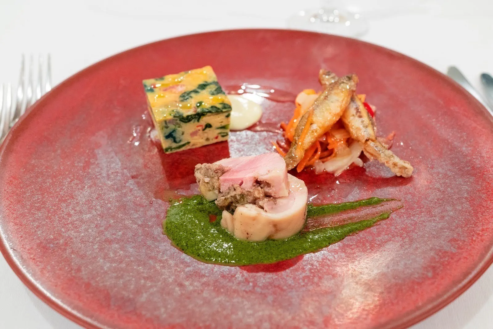 前菜盛り合わせ:フリッタータ、エスカベッシュ、ひらこ地鶏のテリーヌ