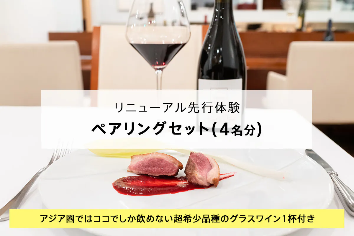 リニューアル先行体験コースで確定した内容を含めたシェフのおまかせコースと、各種ワインのペアリングセットを着席で味わうイベントとなります。