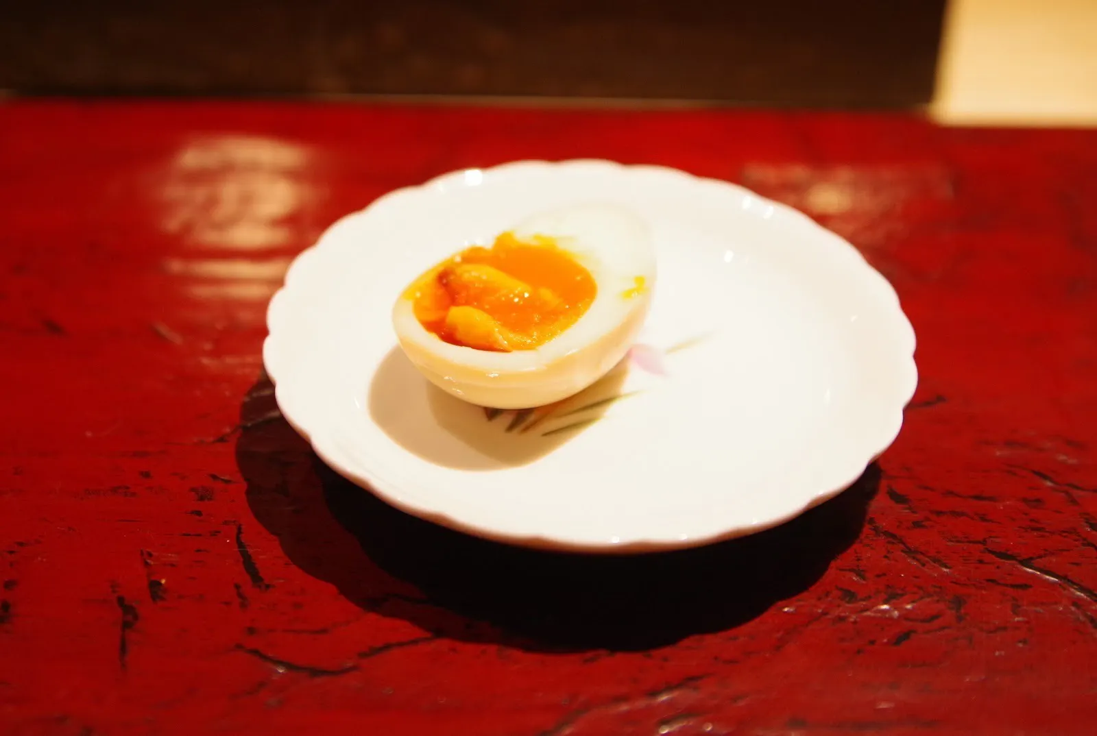 例えば、先付で出された半熟卵。ペアリングは日本酒の「開運」でした。これは卵を口に入れ、よく噛んだタイミングで日本酒を少しずつ口に含みます。