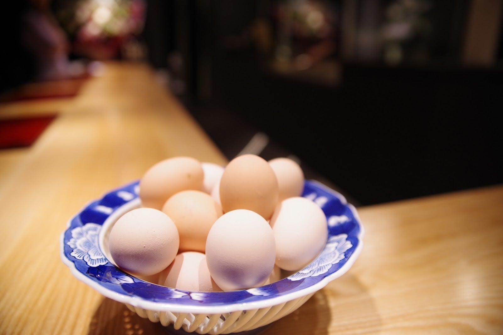市販の卵の中には、添加剤を入れて色を濃くしている卵もありますが、炭火焼処ひらこは完全に自然由来のものなので、黄身の色は1個1個がバラバラ。