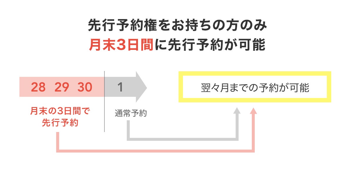 ・通常、翌々月までの予約を当月1日から予約スタートのところ、前月末3日間から予約が可能になる先行予約権
