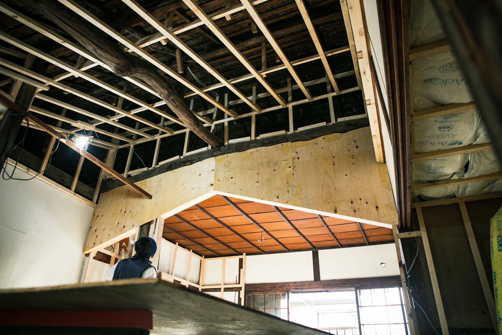 天井は、一部が腐ってしまっていたことや、低く圧迫感があったため、一部の天井を残して剥がしました。そして、剥がしたところに新たに天井を作るための下地作りを行いました。