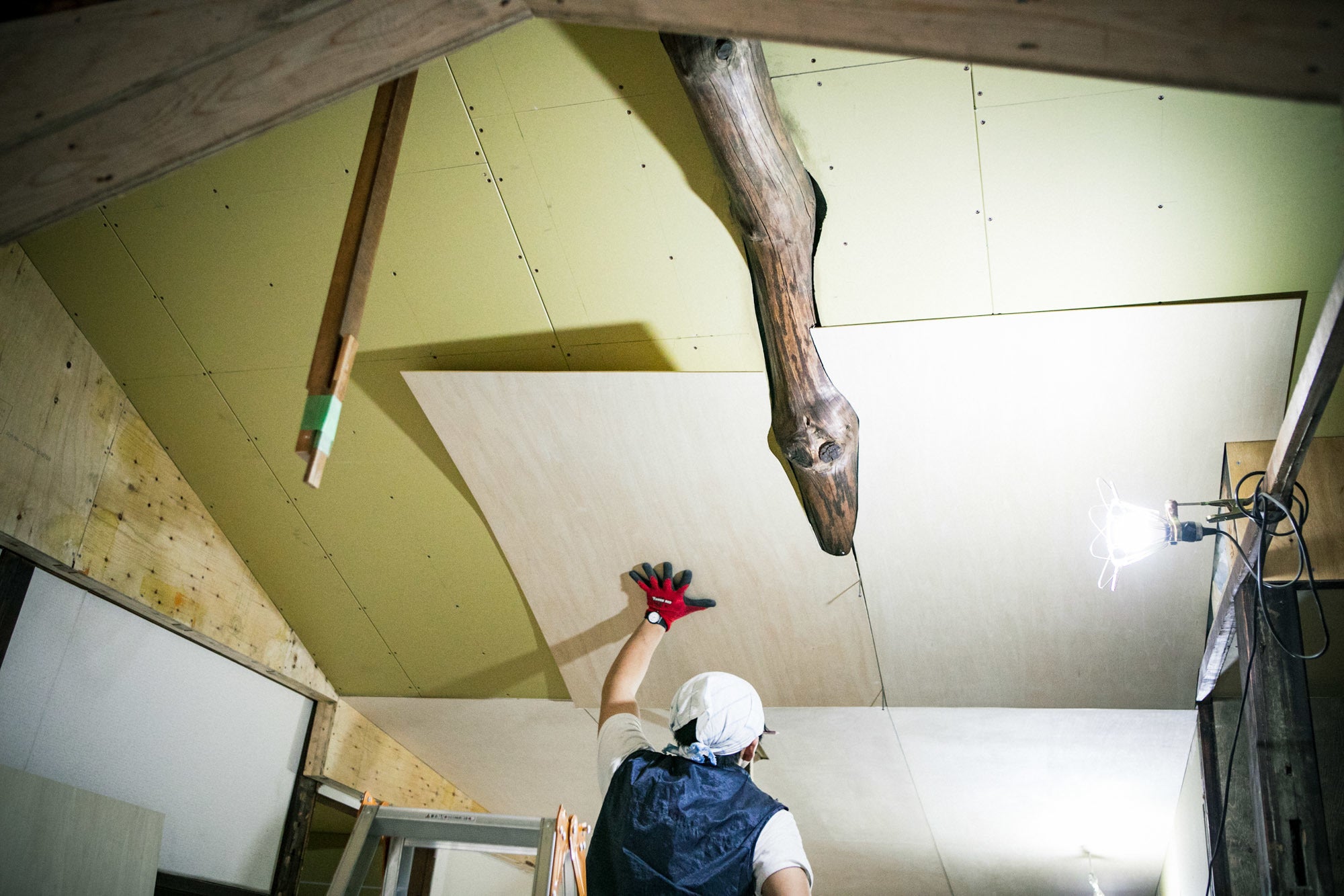 本日ご紹介させていただくのは、古くなっていて一部を残して抜いてしまった天井。抜いた後に新しい天井が貼られ、ガラっと雰囲気が変わりましたが、壁や床・梁などとの相性を考え、ペンキや左官で仕上げるのではなく、石膏ボードを貼りその上に薄いベニヤの板を貼っています。最終的には、薄く塗料を塗って仕上げをしていただきます。