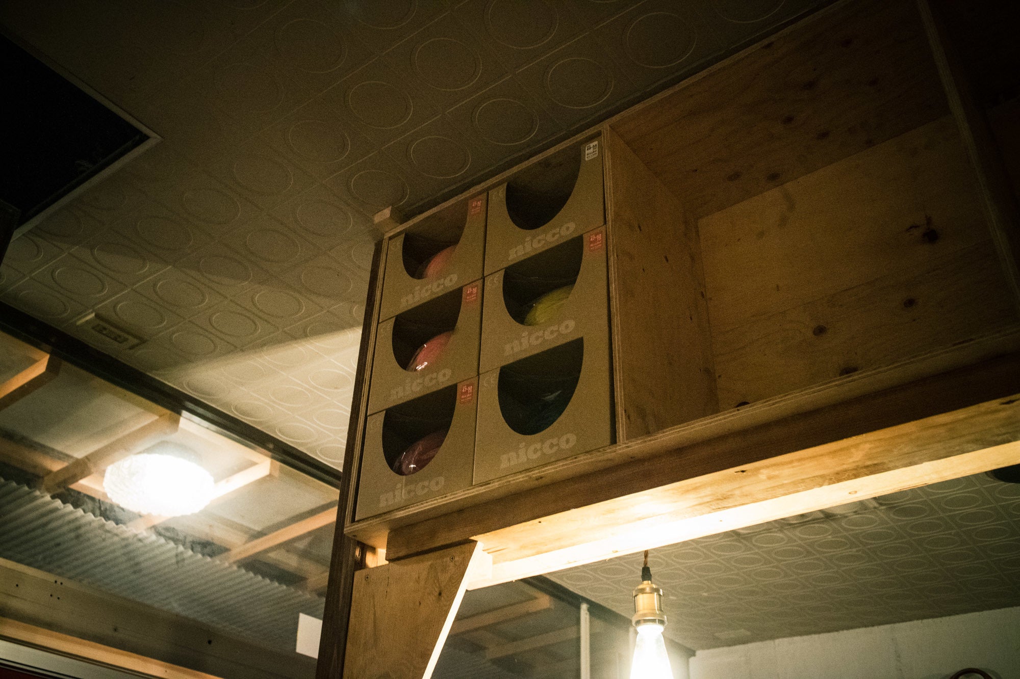 そこで、カウンター上のヘルメットを収納した棚は、2階の伝所鳩を手がけてくれた大工さんが空いた時間でさっと作ってくれたもの。この棚、2階の解体工事で出た廃材のみで作られており、あらたに材料を買い足すようなことはしていません。捨てられるはずの素材をうまく活用していただいていますが、とても良い仕上がりにしていただきました。