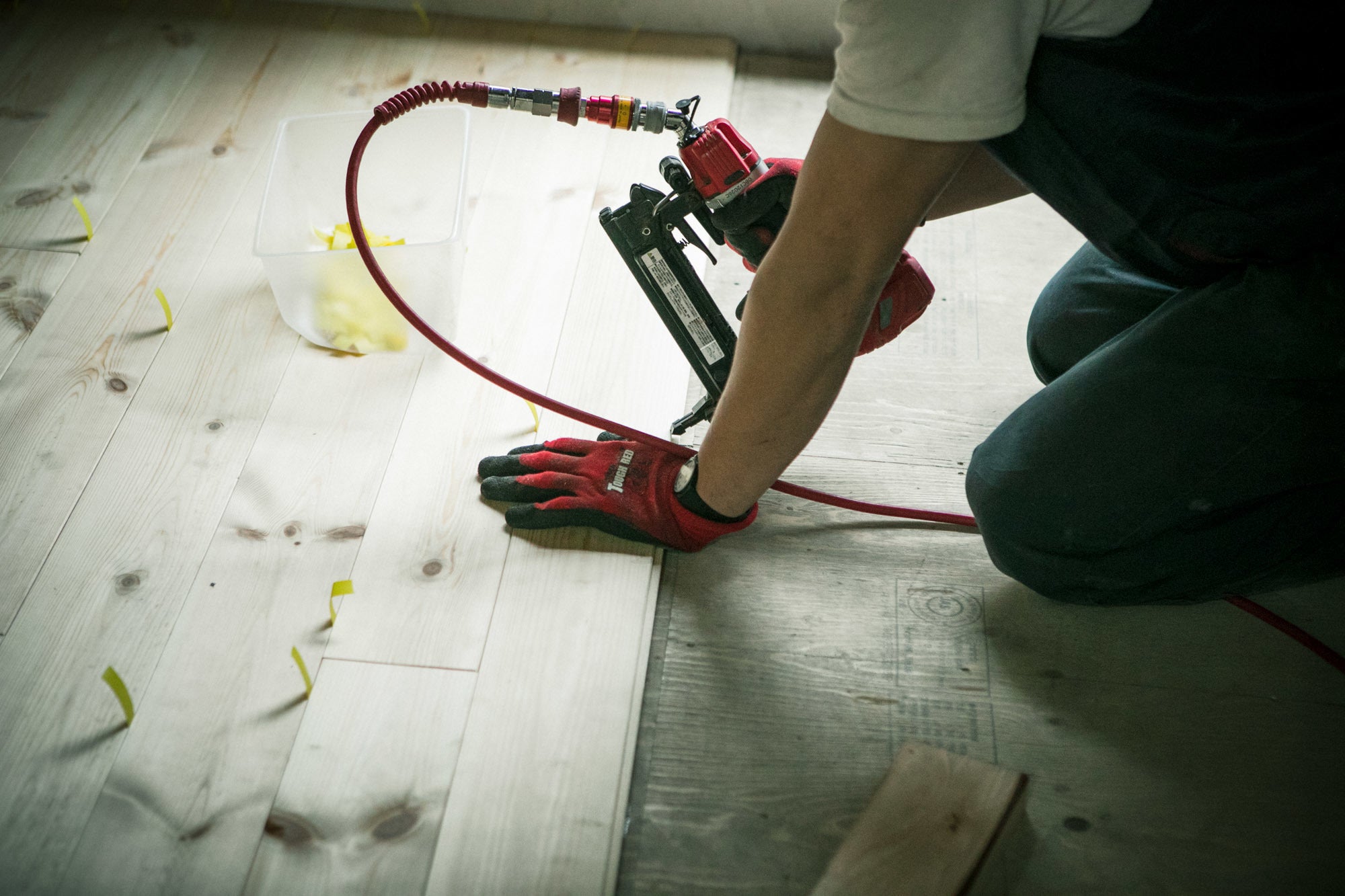 貼る板は「ボルドーパイン」と「レッドパイン」の2種類で迷いましたが、価格も抑えることができ厚みが薄くボルドーよりも色が薄いレッドパインを使うことに。一枚ずつ床が貼られていくと、徐々に室内の雰囲気が変わっていき、全てを貼り終える頃にはぐっと良い空間になりました。