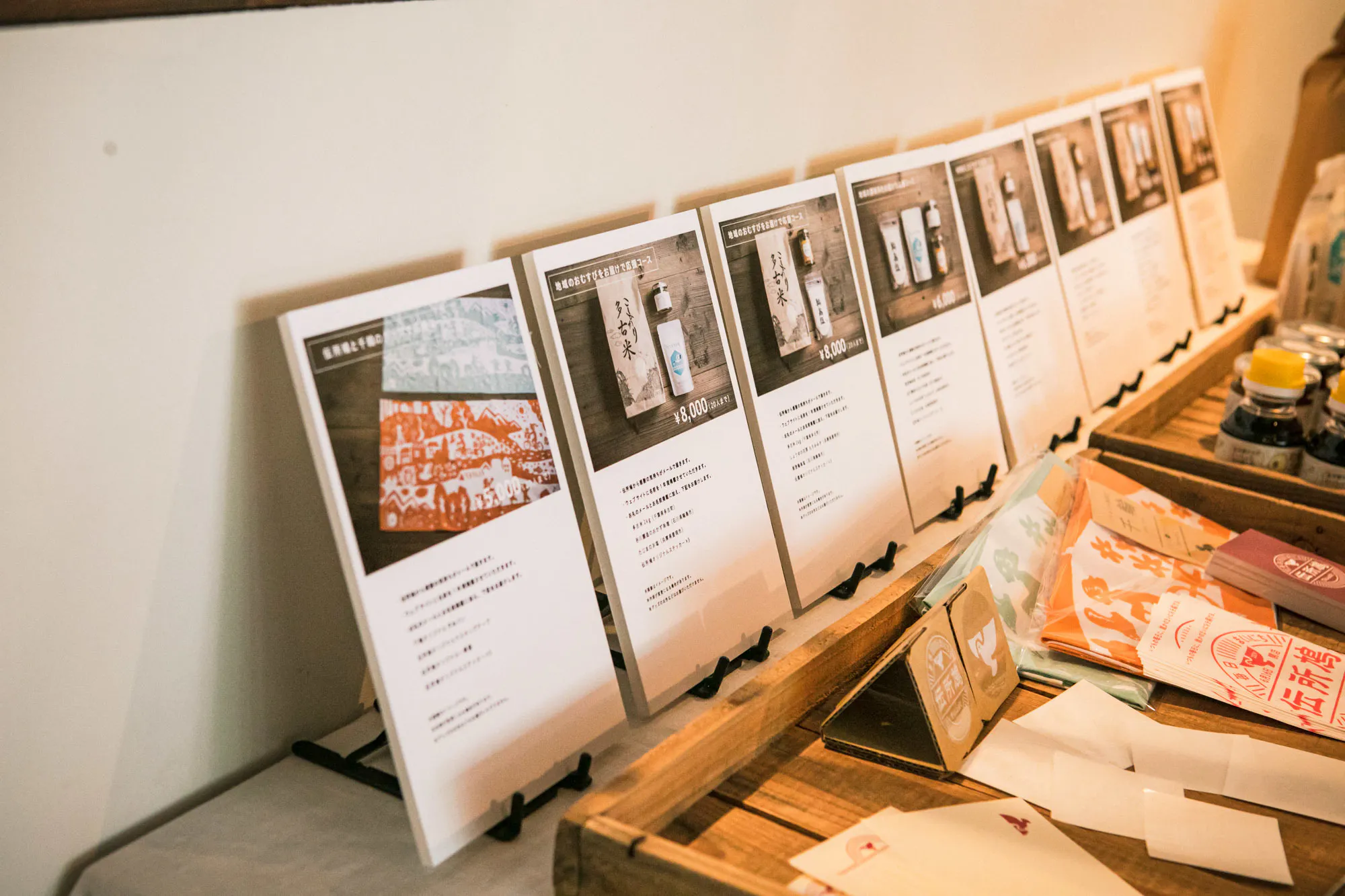 しかし、商品はどれも自信を持っておすすめできるものですが、たくさん種類があることで分かりづらく、選ぶ際にも迷ってしまうので、今回の展示では、返礼品を紹介するポップをずらっと全部店内に並べてみました。ポップと合わせて商品を並べることで、照らし合わせながら返礼品を選んでいただくことができます。購入も可能です!