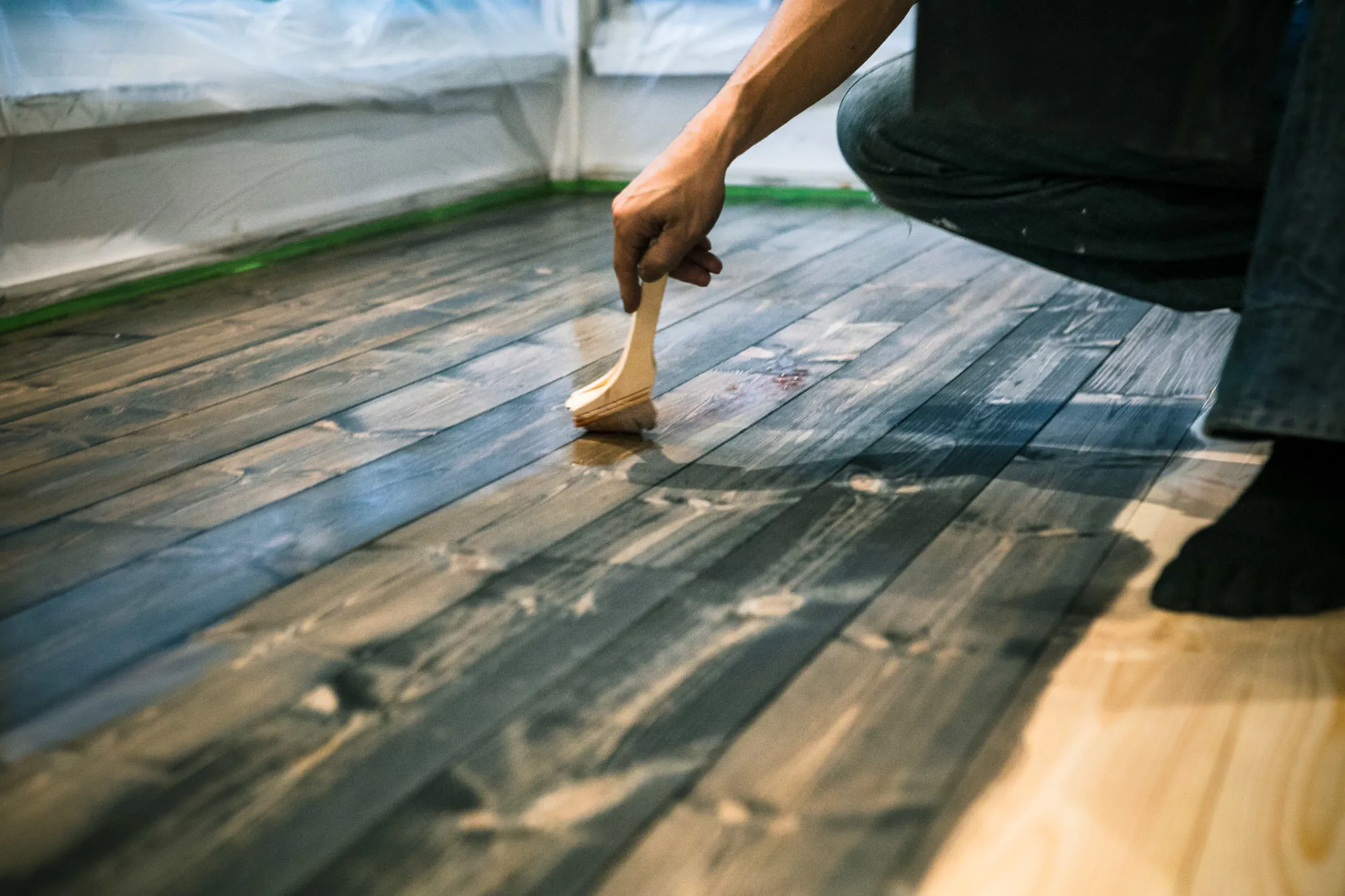 床には、レッドパインを大工さんに一枚ずつ丁寧に貼っていただきましたが、素材のままでは色味が明るく空間の雰囲気と合わなかったり、土足でお客さまに入っていただくと汚れが目立ってきてしまう恐れがあるため、墨汁を塗った後、柿渋で仕上げることにしました。