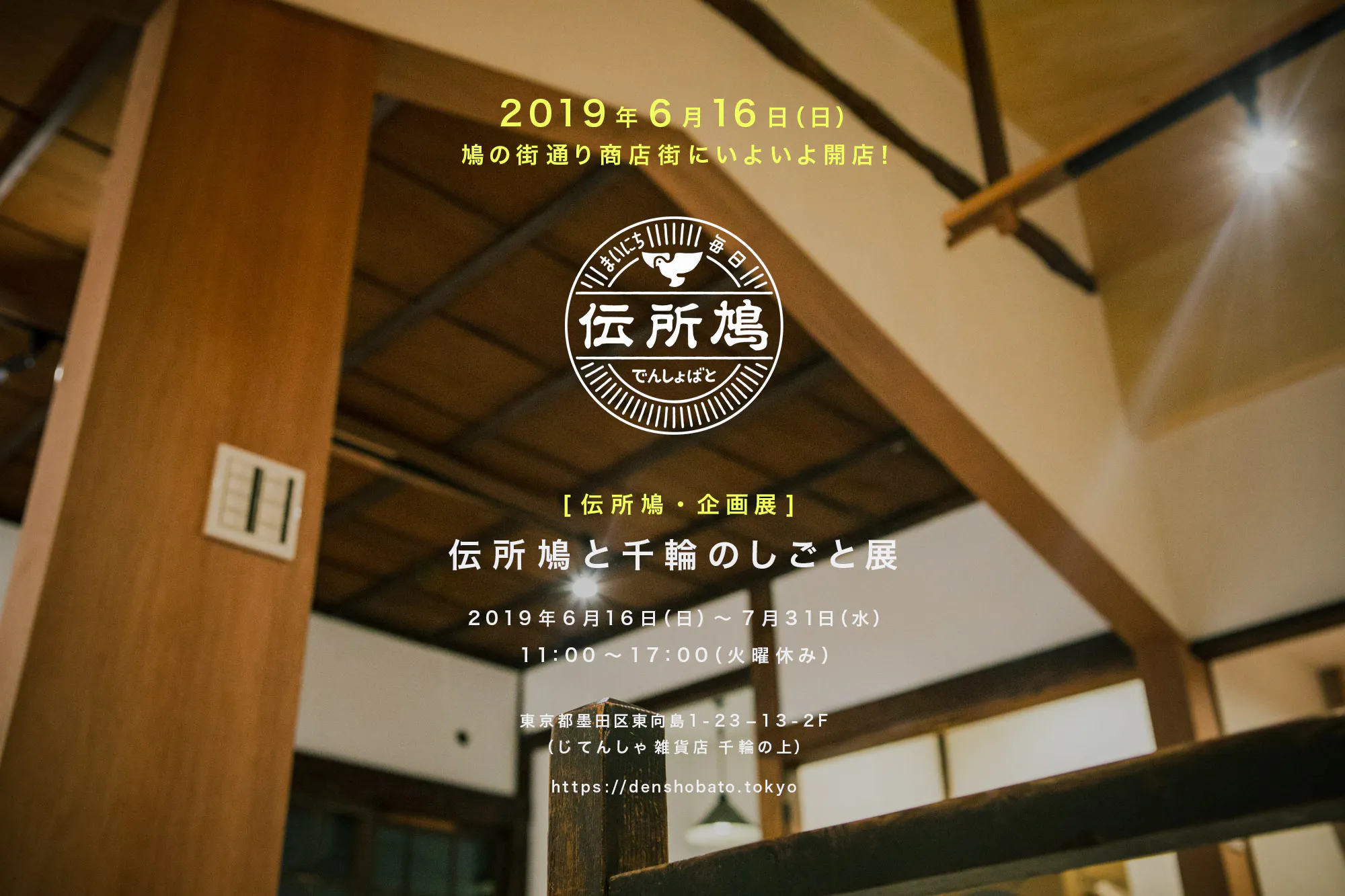この展示は、2019年6月16日にオープンする伝所鳩のご紹介、そして1階でリニューアルオープンした千輪、伝所鳩に関わるメンバーのそれぞれの取組みを紹介した「伝所鳩はじめの展示」となります。
