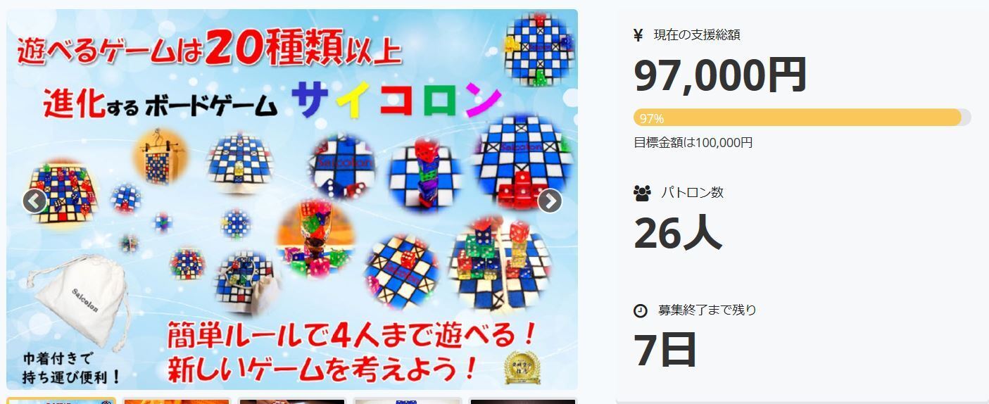 残りあと7日!現在97%。多分・・・多分100%は達成できそうな気がします。ご支援いただいた皆様、情報を拡散してくださった皆様、本当にありがとうございます。ここまで来て「100%達成できませんでした」となると大変残念ですので、是非周りにサイコロンのようなゲームが好きそうな方がいたら、お声がけいただけると幸いです。さて、今話題の(未来の)人気YouTuberすぎうら総本家【ボドゲ 一家】様が、またまたサイコロンを遊んでくださいました。前回の「サイコロンシアム」に引き続き、今回は「バトルサイコロン」です。前回の動画が9分に対し、今回の動画は19分。こんなに長い時間、ありがとうございます。サイコロンにはこのように、短時間で終わる盛り上がる系のゲームから、時間がかかる思考系のゲームまで様々なゲームがあります。現在20種類のゲームで遊べますが、サイコロンは今後もどんどん遊べるゲームが増えます。すでにいくつか面白いゲームのストックはあるのですが、検証やルールの言語化などで時間がかかっております。しかし、クラウドファンディング終了までに1ゲームは増やす予定です。NPL代表 永盛 敬将 (発明家)