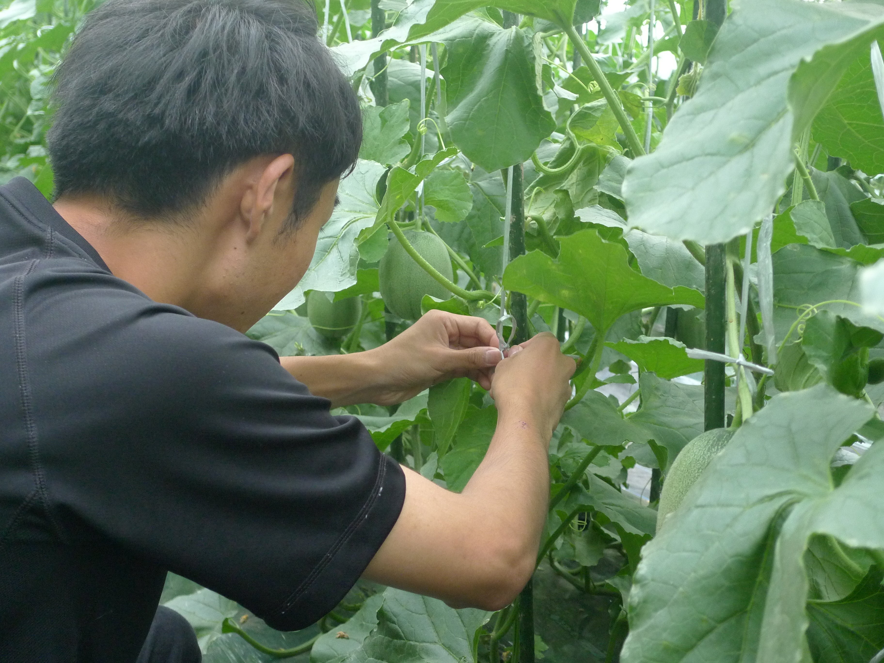 2019年6月10日(月)、メロン果実が大きくなってきたので、学生諸君と玉吊作業を行いました。