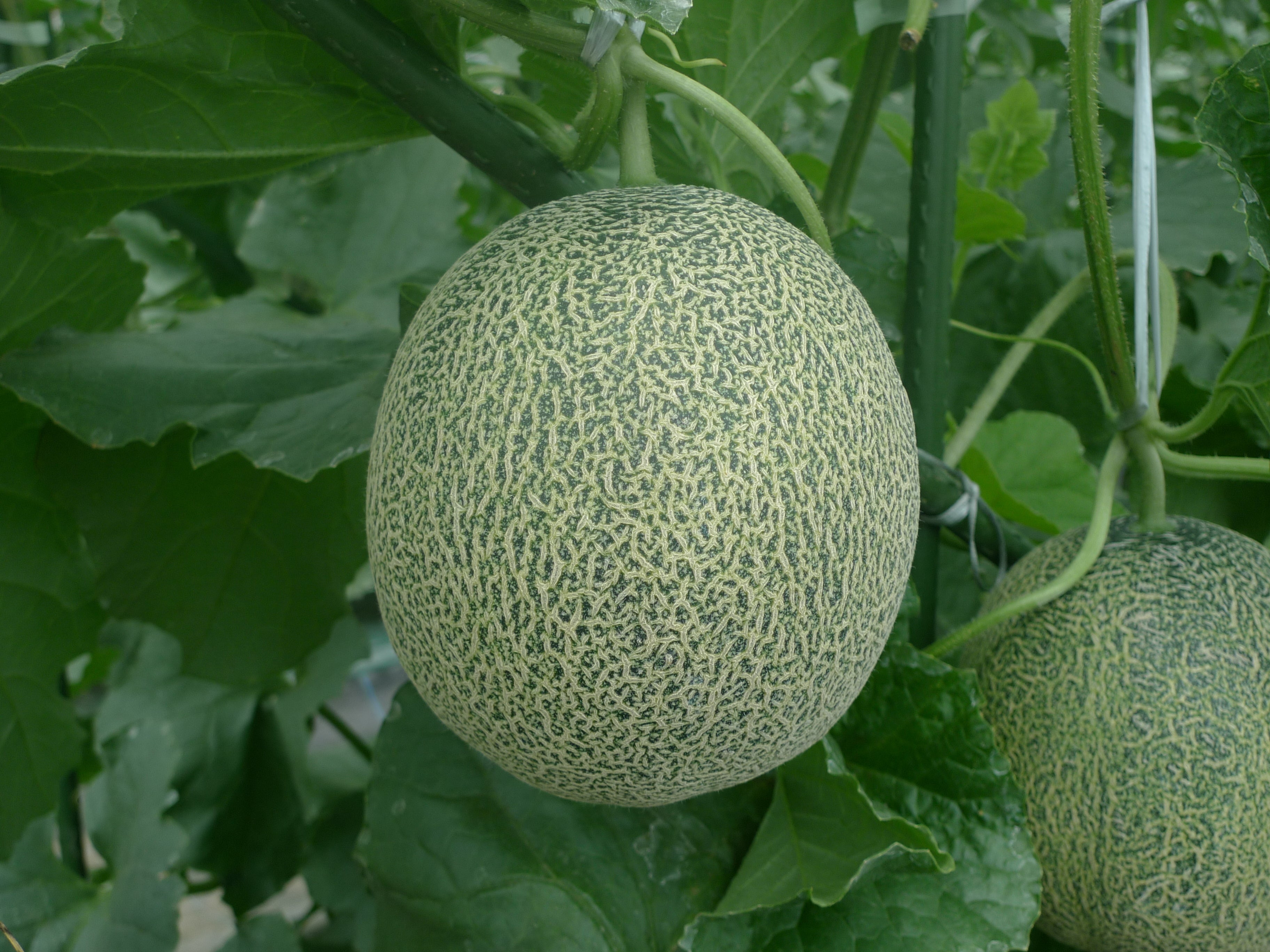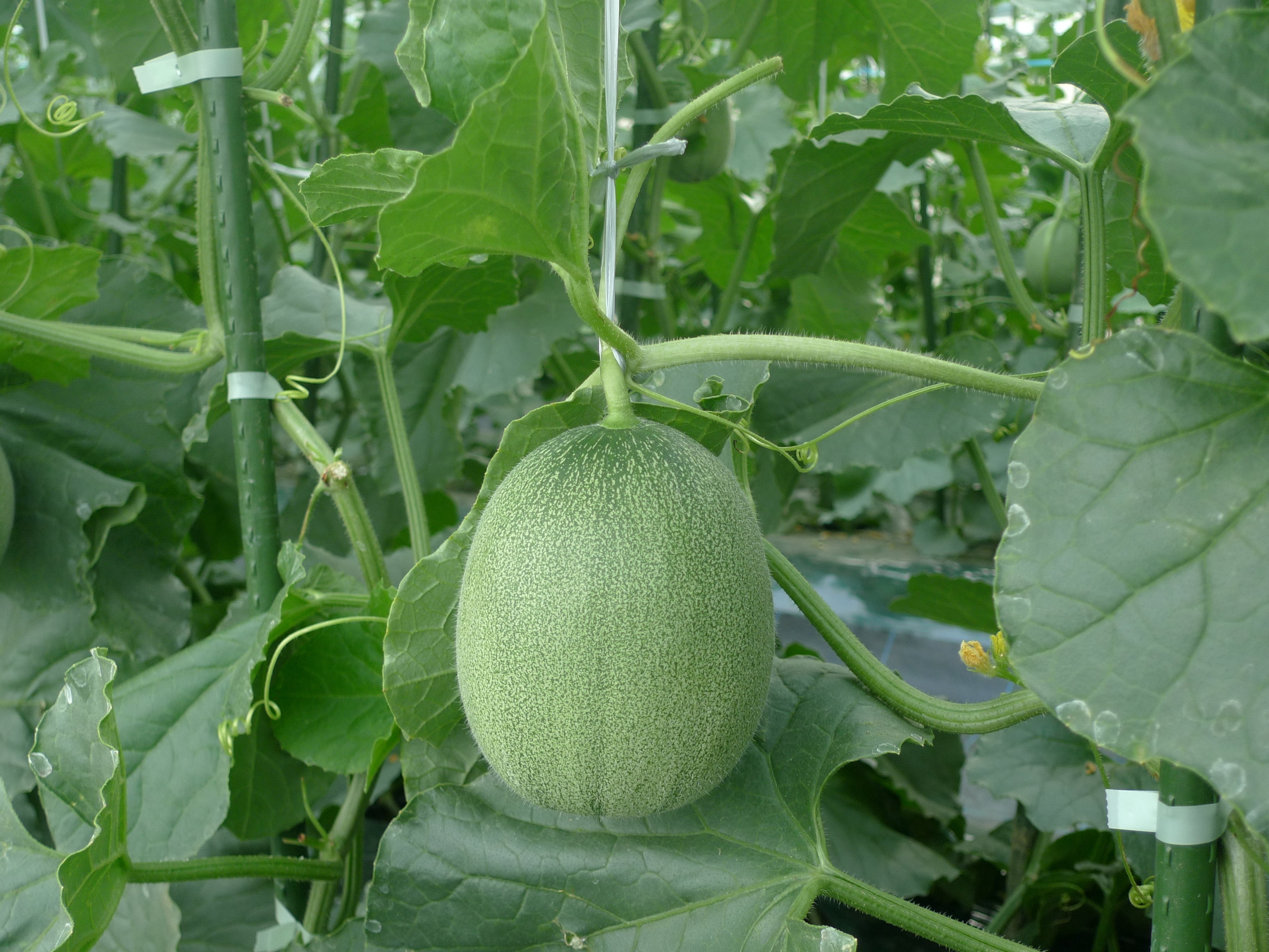 2019年6月10日(月)、メロンの糖度を上げるため、1株に1玉の果実が紐でつられています。