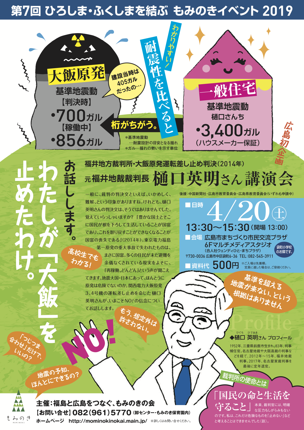 2019/04/22 15:31〈御礼とご報告:樋口英明さん講演会、満員盛況となりました〉いよいよ迎えた講演会当日、広島は汗ばむような陽気、晴天に恵まれました。市内は広島カープの地元試合デーゲーム、ちょっと調子が上向きになったこともあり、町には赤いユニフォーム姿も目立ちます。カープ日和は、講演会日和! お天気も味方です。講演会場は、13時開場の前からロビーに続々と参加者が集まり、10分早く開場。おかげさまで、満員盛況となりました。演者の樋口さん、簡潔で明快、容易に理解できる内容で、ときに会場の笑いを誘うユーモアも交え、なぜ原発は危険なのか、原発裁判における司法の役割とは何か、真の科学的とはどういうことなのか、などを熱く語ってくださいました。そして最後に、「きょうここで聴いた話を、自分の頭で再構成し、周りの人に伝えてください」と。参加者の一人は「これまでの人生の中で、いちばんわかりやすい講演だった。そういうことだったのだ、とはっきりわかった」と語ってくれました。会場には、市内の高校の新聞部員も取材に訪れ、講演終了後、熱心に取材している姿が印象的でした。講演の詳しい内容をお知りになりたい方は、ぜひクラウドファンディングにご協力ください。リターンでしっかりお伝えいたします。◇福島と広島をつなぐ、もみのきの会 http://mominokinokai.main.jp/ もっと見るご支援いただき、ありがとうございました。