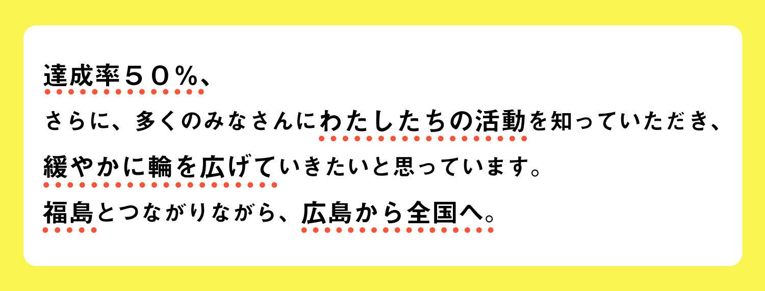 資金を集めることが目的ではありますが、これを通してわたしたちの活動を知っていただき、思いを伝えることも大切なことだと考えています。