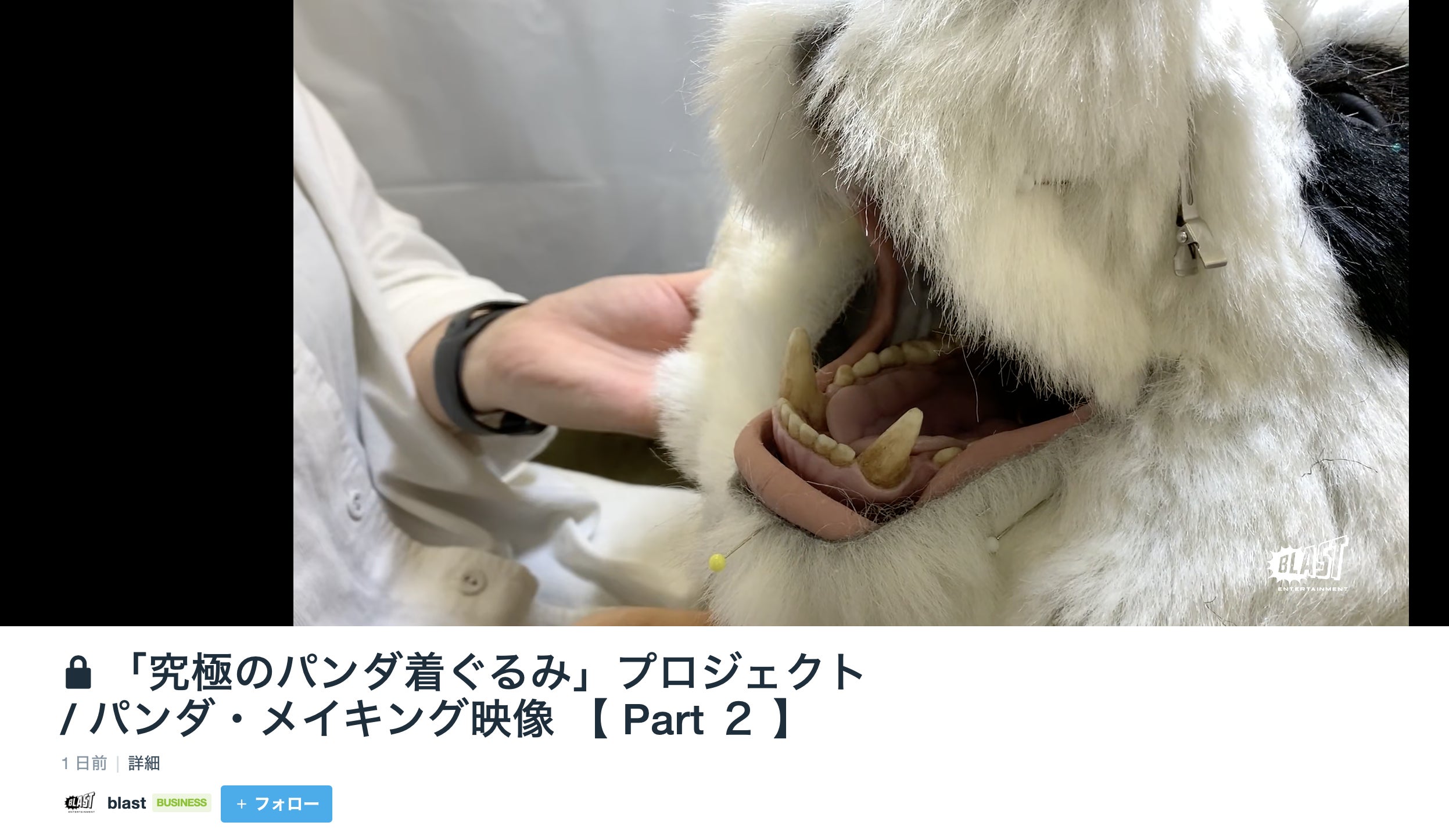 「究極のパンダ着ぐるみ」プロジェクトの、特殊造型スタジオ ゼペットです。【3:限定配信!制作メイキング&完成プロモーション映像】の、制作メイキング映像 最終回、第三弾の配信が本日スタート致しました!すでにショートムービーにて公開しておりました、完成した「究極のパンダ着ぐるみ」映像のロングバージョンをたっぷりお届けしております!ご支援いただいた皆様に、先ほど13時頃 Eメールにて動画情報をご連絡しておりますので、本リターンをご選択いただいたご支援者様は、ご確認いただきますようお願い致します。※本プロジェクトからのEメールが見つからない場合、迷惑メールフォルダに振り分けられているか、受信を拒否されている可能性がございます。先日CAMPFIREメッセージにてご連絡したドメインの受信設定を今一度ご確認ください。※Eメールが届いていない場合、お手数をお掛け致しますが、CAMPFIREメッセージにてご連絡下さい。再度ご送付させていただきます。制作メイキング映像が終了し、残すは完成プロモーション映像のみとなりました。最後のリターンのお届けまで、どうぞお楽しみにお待ち下さい!