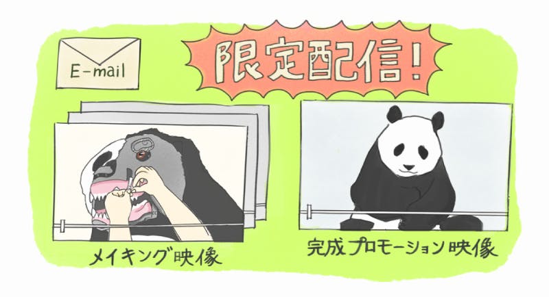 パンダ着ぐるみのメイキング映像と、完成プロモーション映像を電子メールで限定配信致します。