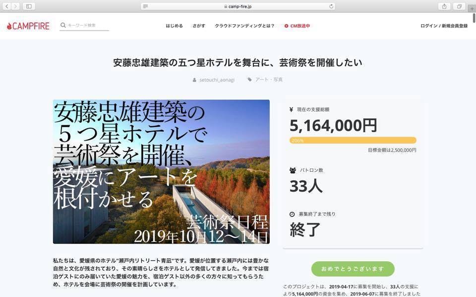 2019/06/10 10:486月7日をもちましてクラウドファンディング終了となりました。2,500,000円の目標に対し5,164,000円(達成率206%)という、想像以上の額のご支援を賜り、無事にイベント開催となりました。 ご支援を頂いた皆様、シェアなどで情報拡散にご協力いただいた皆様、本当にありがとうございました。 まだまだ参加アーティストも増えていきますが、これから夏まで、しっかりと下準備をさせていただき、8月頭くらいにはオフィシャルサイトOPENと共に、正式に情報をリリースしたいと思います。 イベント名は、 瀬戸内リトリート青凪 文化音楽芸術祭 となります。文化と音楽と芸術と、盛りだくさんな内容で皆様をお迎えしたいと存じます。 どうぞ引き続きよろしくお願いいたします。 瀬戸内リトリート青凪 支配人 もっと見る