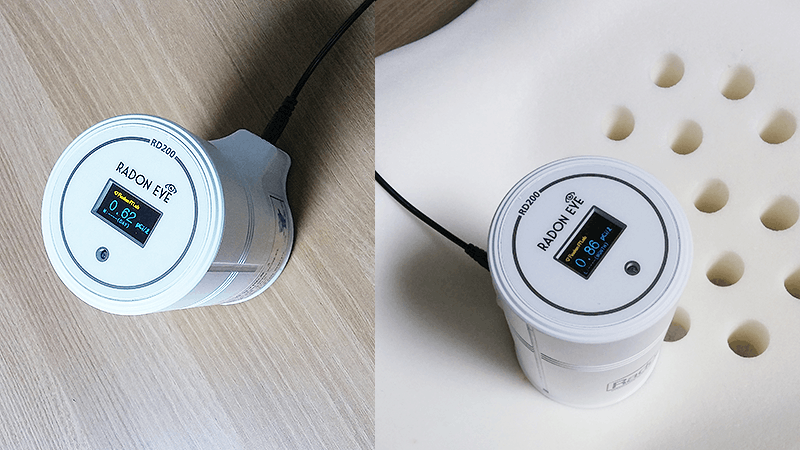 右側: ラドンカウンターをベビーステラ逆流防止無重力新生児用ベッドの上に1時間30分放置した場合のラドン濃度は0.86pCi / L