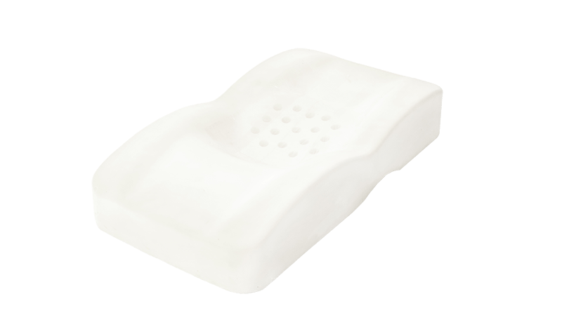 柔らかいウレタンフォーム製で、絶壁頭の防止効果もあります。一般的な市販の絶壁防止枕のように、中央部がへこんだドーナツ型ではありません。へこみの部分に赤ちゃんの頭が固定されてしまうと、赤ちゃんがきゅうくつがったり、絶壁防止にむしろ良くない影響を与えかねないので、柔らかいウレタンフォームと少しカーブをつけた形状で絶壁防止機能を実現しました。