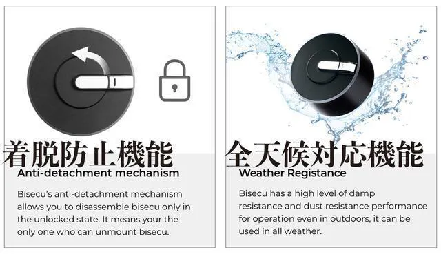 A. bisecu(バイセキュ)は、高レベルの防湿性能と防塵性能を備えています。全天候で使用できます。しかし、bisecuを水の中に入れないことをお勧めします。