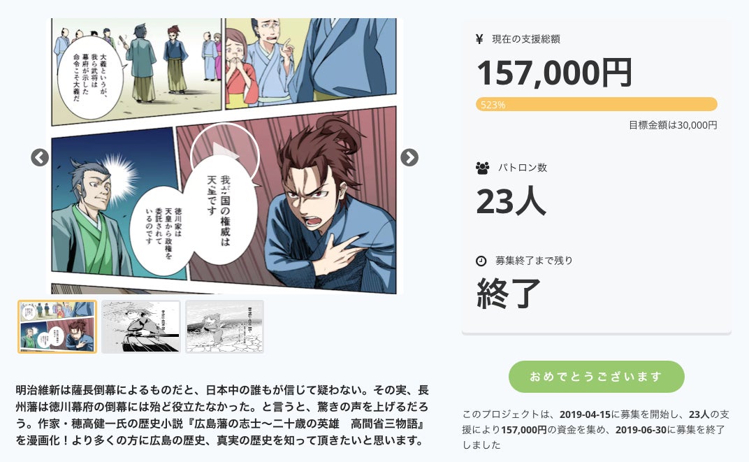 6/30を持ちまして当プロジェクトによるクラウドファンディング『【幕末彼氏伝〜高間省三物語〜】マンガ化プロジェクト☆倒幕の主役は広島藩だった!』が達成率523%で終了いたしました!
