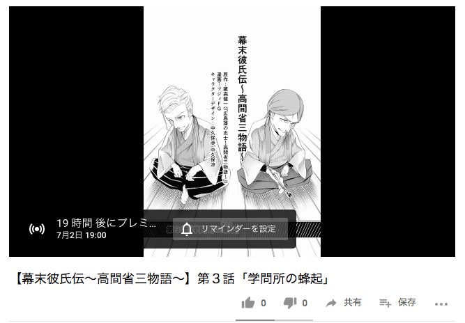 いつもご支援とご協力を頂きまして、誠にありがとうございます。第三話「学問所の蜂起」の漫画動画の確認が終わりましたので、Youtubeにて配信いたしました。漫画動画は多くの方に見て頂けるように、無料で公開しております。ぜひ「神機隊」「高間省三」、幕末期における「広島藩の志士」の活躍を多くの方へ伝えていけたら幸いです。引き続きよろしくお願い致します。